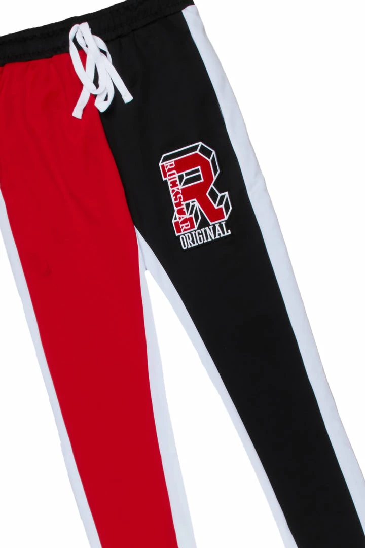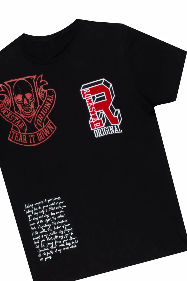 Rockstar Original Men’s two-piece tracksuit set in black and red. Featuring printed RSO varsity letters and graphics throughout the top and bottoms. Tee accents a crew neckline and relaxed fit while bottoms accent a duo tone color block design with a drawstring waistband, multiple pockets and ankle zipper inseams.