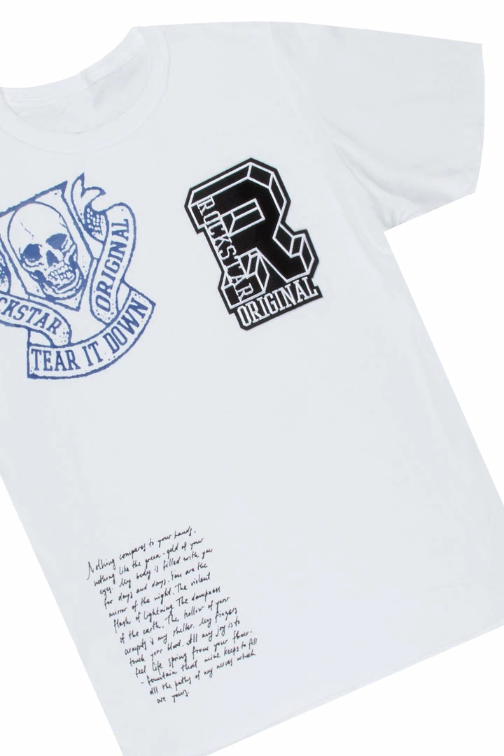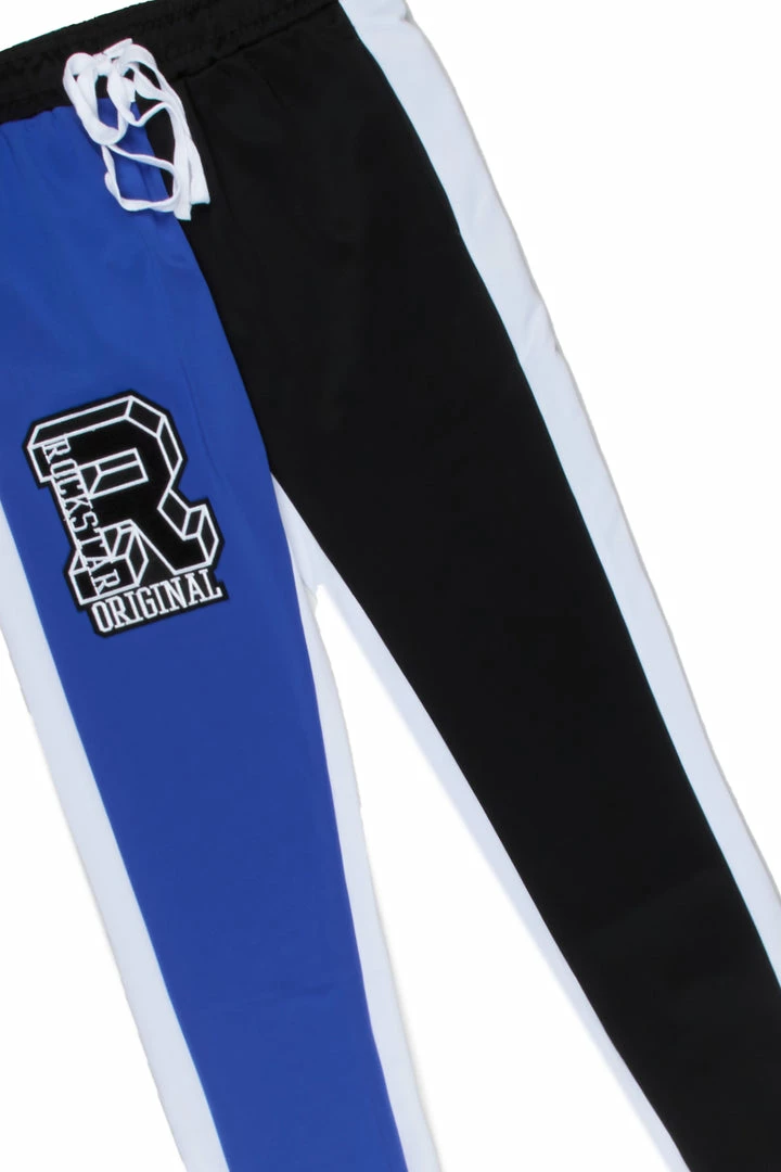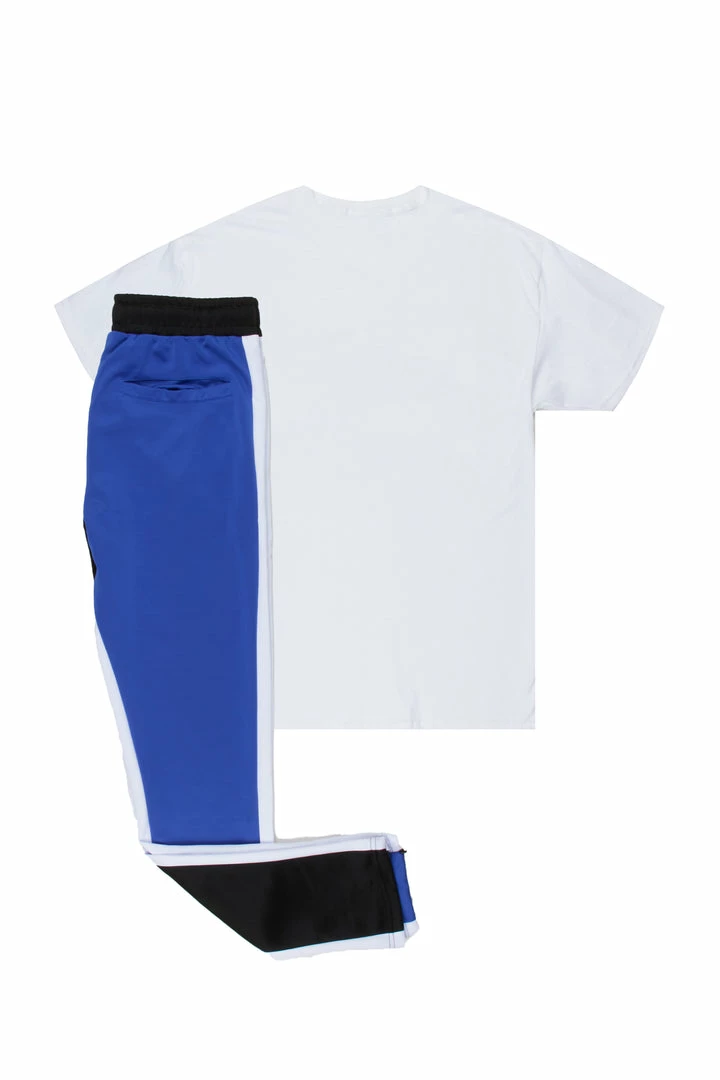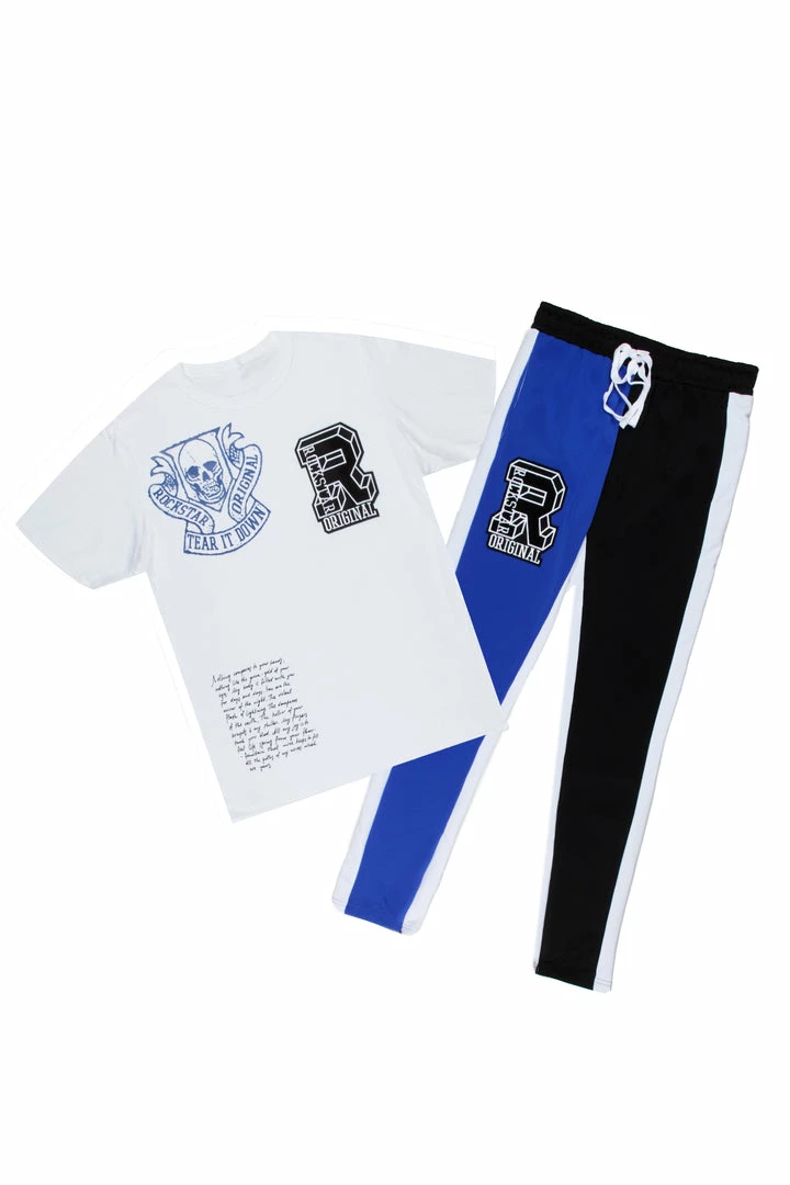 Rockstar Original Men’s two-piece tracksuit set in white and blue. Featuring printed RSO varsity letters and graphics throughout the top and bottoms. Tee accents a crew neckline and relaxed fit while bottoms accent a duo tone color block design with a drawstring waistband, multiple pockets and ankle zipper inseams.