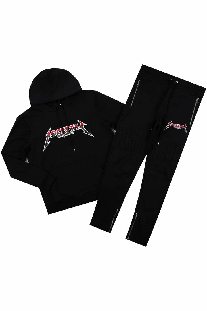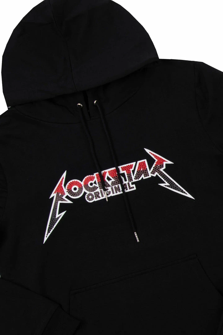 Rockstar Original Men’s tracksuit set featuring a two-piece hoodieย and pant.ย Hoodieย and pant feature’s aย multi colored rhinestone RSO logo. Signature moto biker design pant with drawstring waistband and zipper pockets.