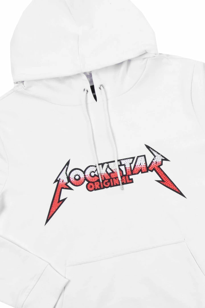 Rockstar Original Men’s tracksuit set featuring a two-piece hoodie and pant. Hoodie and pant feature’s a multi colored rhinestone RSO logo. Signature moto biker design pant with drawstring waistband and zipper pockets.