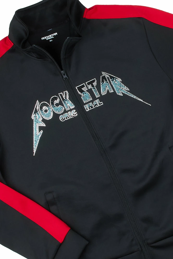 Rockstar Original Men’s two-piece tracksuit set in black. Featuring rhinestone RSO logos on the top and bottom with racer stripe designing throughout. Jacket accents a posterior rhinestone skull graphic and a high quality full-zip stand up collar with front pockets and elastic ribbed cuffs. Bottoms accent a drawstring waistband, multiple pockets and ankle zipper inseams. This lightweight set is the perfect all day wear ‘fit.