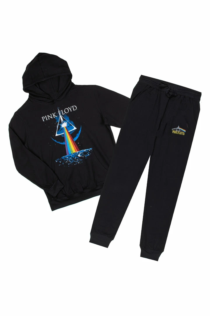 Rockstar Original Men’s two-piece sweat pant set inΒ black. Featuring aΒ Pink FloydΒ logo on the top and bottoms. Top accents aΒ drawstring hoodΒ and ribbed cuffs and hemline while bottoms accent a drawstring waistband, side pockets and ribbed cuffs. Designed with luxurious cotton for a super soft internal finish.