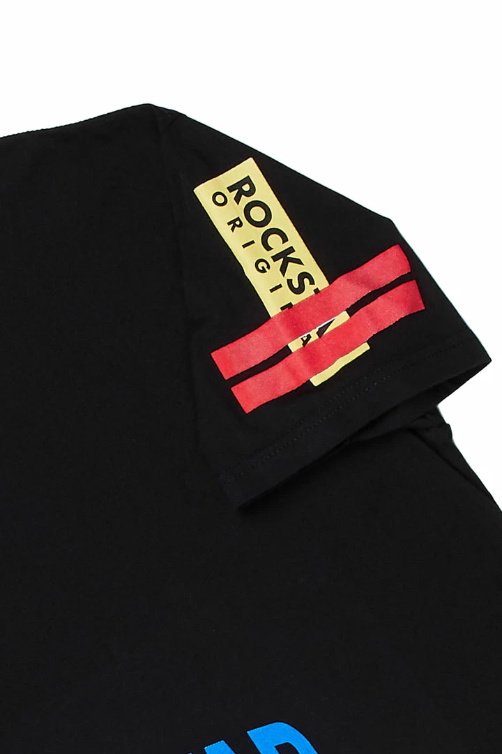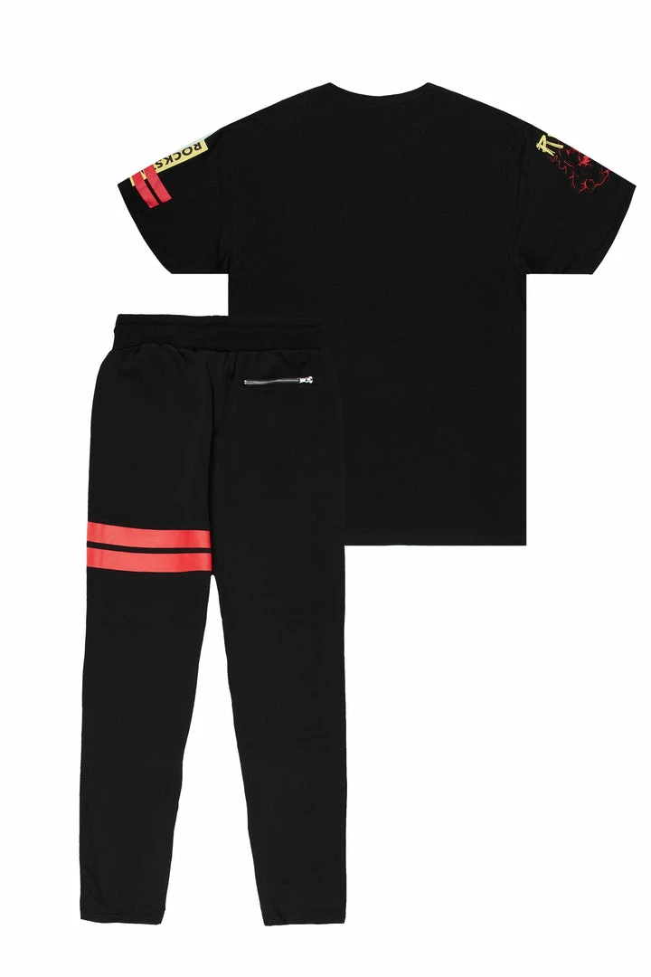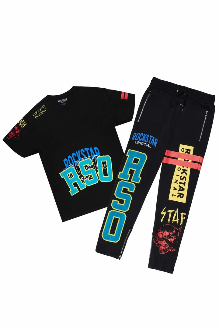 Rockstar Original Men’s two-piece tracksuit set in black. Featuring printed multi color and multi font RSO logos and custom graphics throughout. Top accents a crew neckline with short sleeves and a relaxed fit. Bottoms accent an embroidered RSO logo at the lower leg with a drawstring waistband, high-quality zipper pockets and ankle zipper inseams.