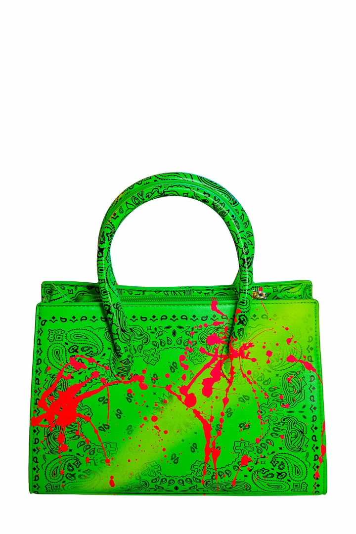 Rockstar Original Women’s bag featuring a gorgeous faux leather paisley print design in popping neon green. Accenting a matching print strap, RSO logos, and bold paint splatters.