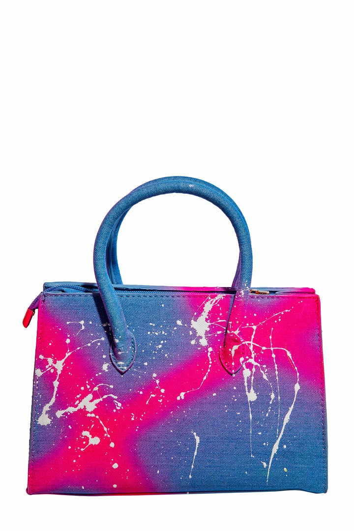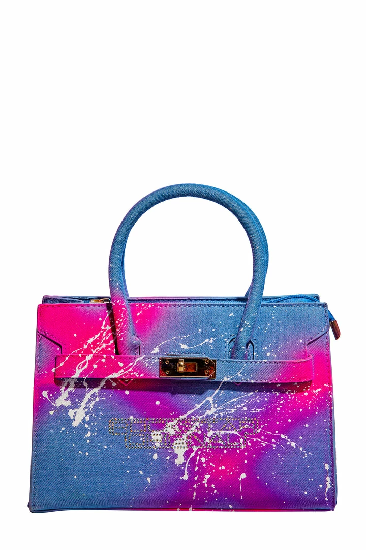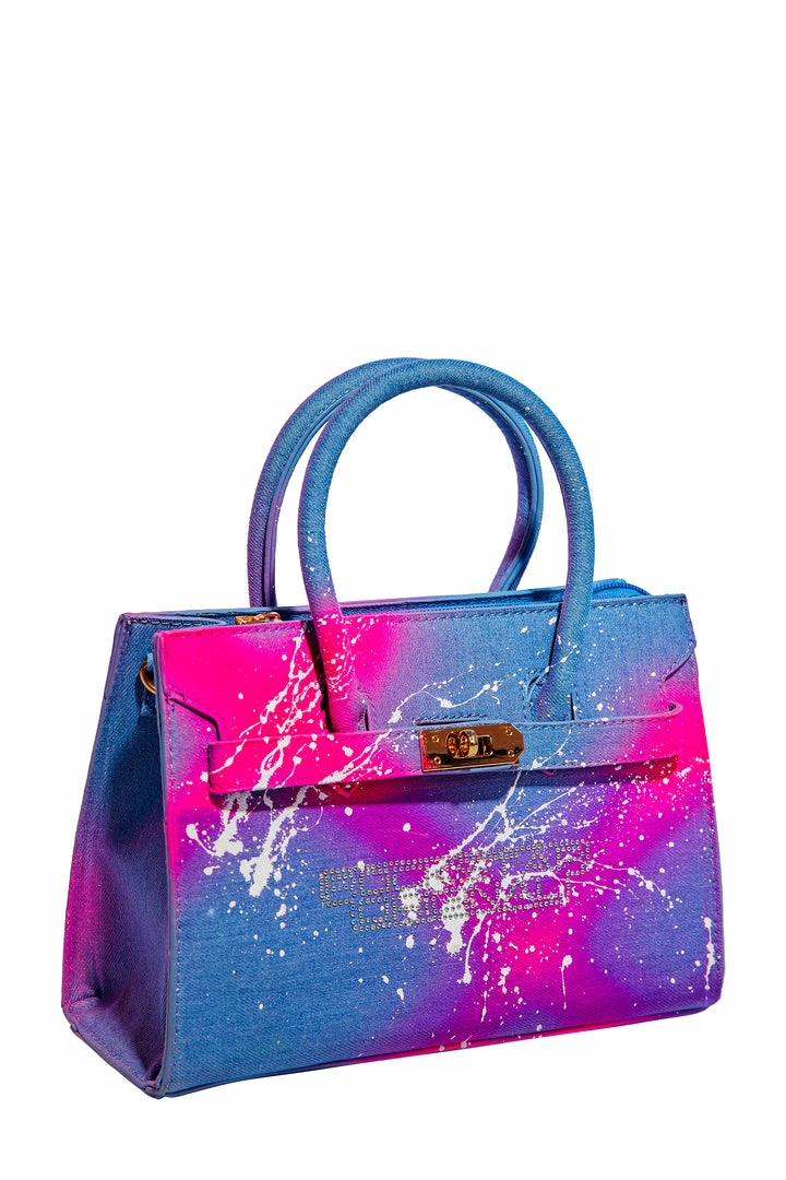 Rockstar Original Women’s bag in classic denim featuring an iconic shape, paint splatters throughout, and a rhinestone RSO logo.Accenting a matching denim strap and double handles for a classic look.