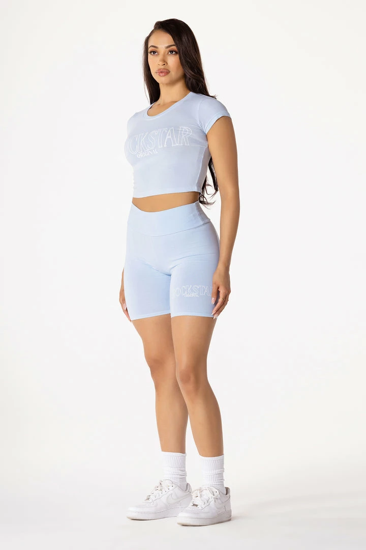 Rockstar Original Women’s two-piece short set inย baby blue. Featuring printed RSO logos on the top and bottoms. Top accents a crew neckline with a cropped length while bottoms accent a high-waisted, form-fitting silhouette with a bikerย short length.ย