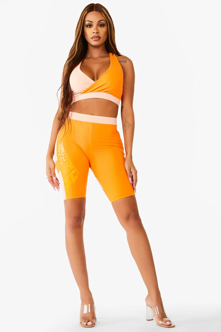 Rockstar Original Women’s two-piece active biker set with matching sports bra and heart detailing with bold Rockstar Original logos.