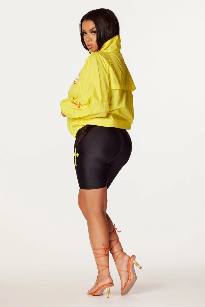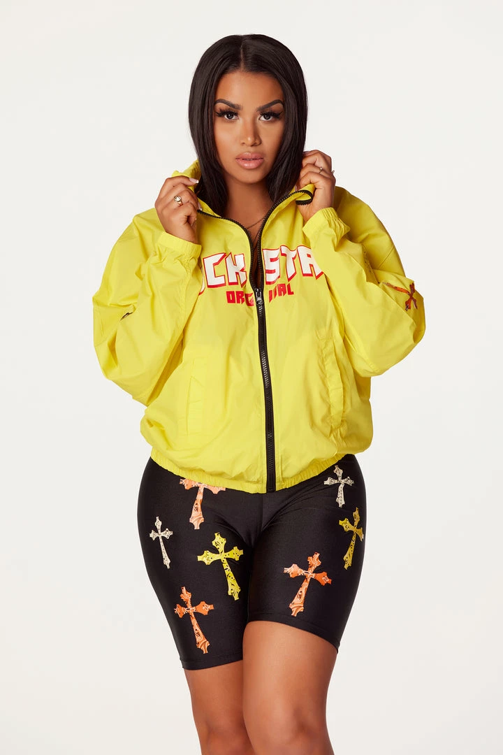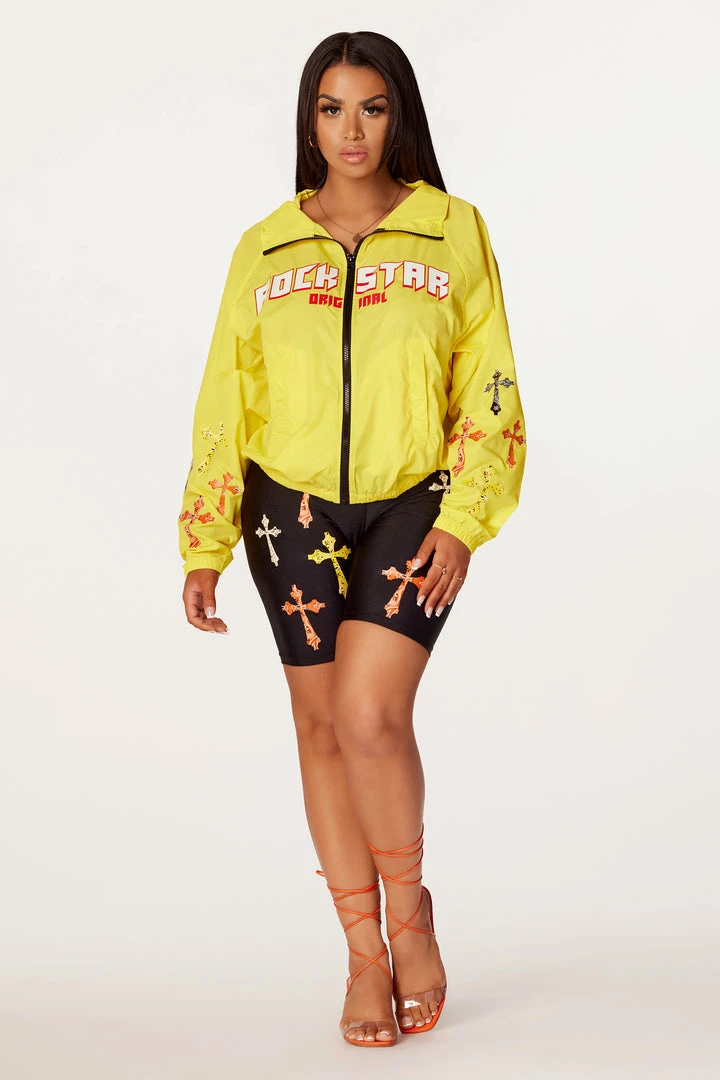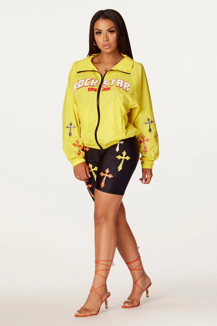 Rockstar Original Women’s two-piece biker short set in yellow. Featuring a printed RSO logo on the top with multi color cross graphics throughout. Top accents a relaxed windbreaker jacket with a high quality stand-up collar and side pockets. Bottoms accent a high-waisted silhouette and biker short length.