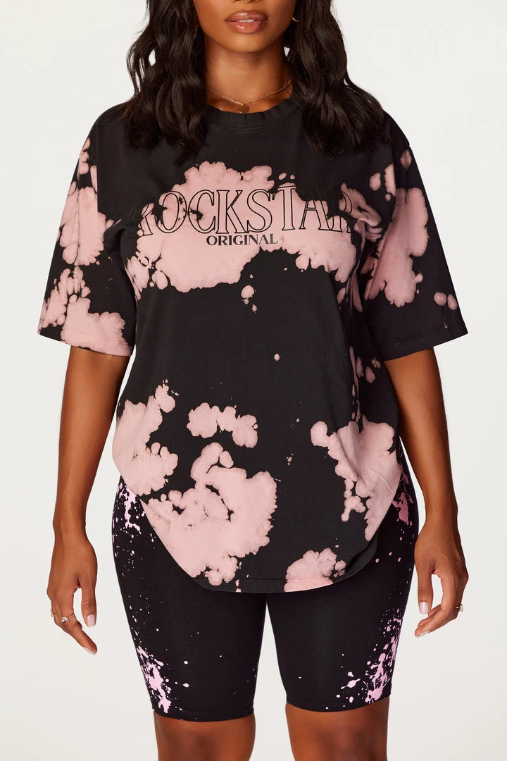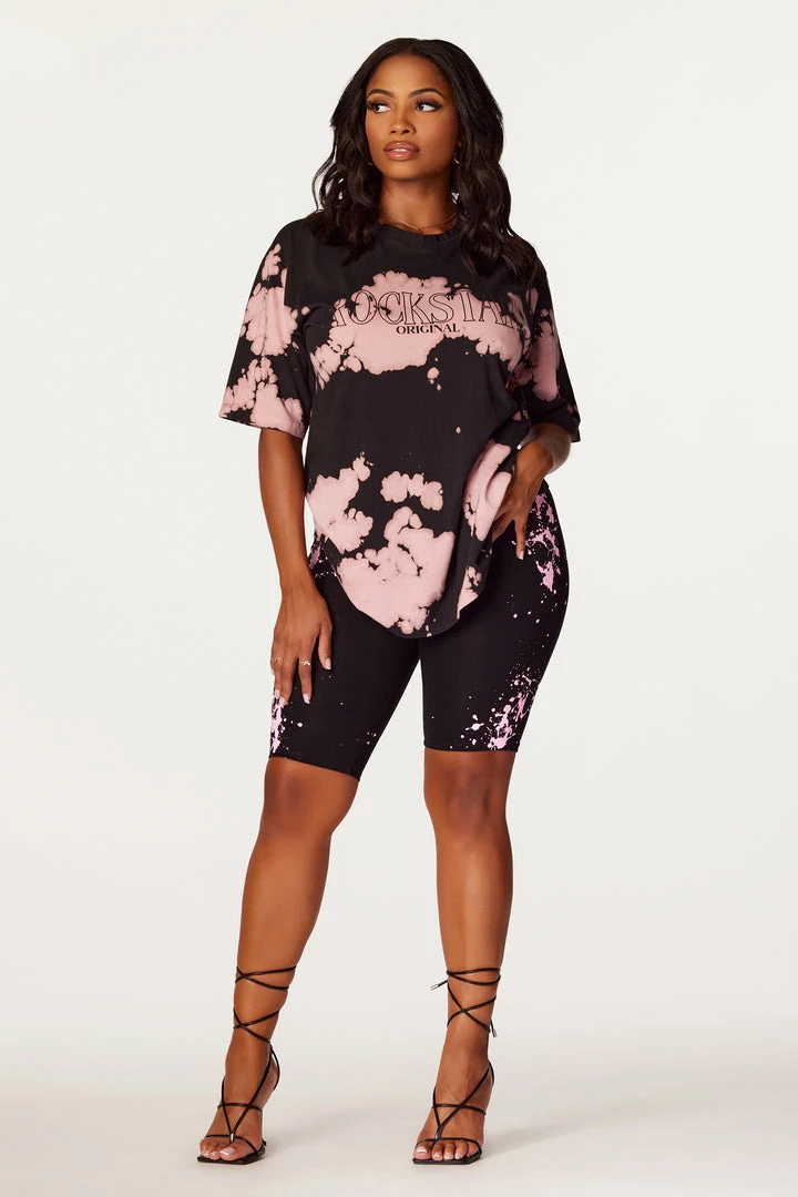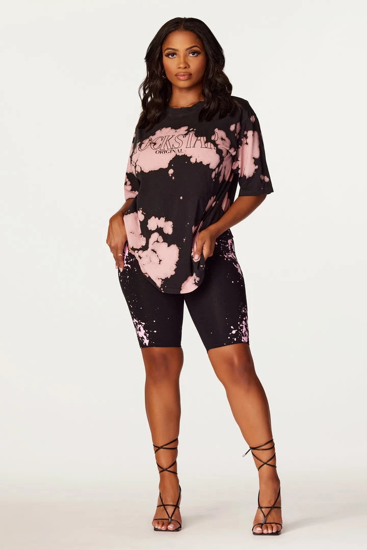 Rockstar Original Women’s two-piece short set in black. Featuring a printed RSO logo on the tee with custom paint splatter detailing on the bottoms. Tee accents a crew neckline with an oversized fit and bleached designing while shorts accent breathable stretch fabric and a mid-length fit.