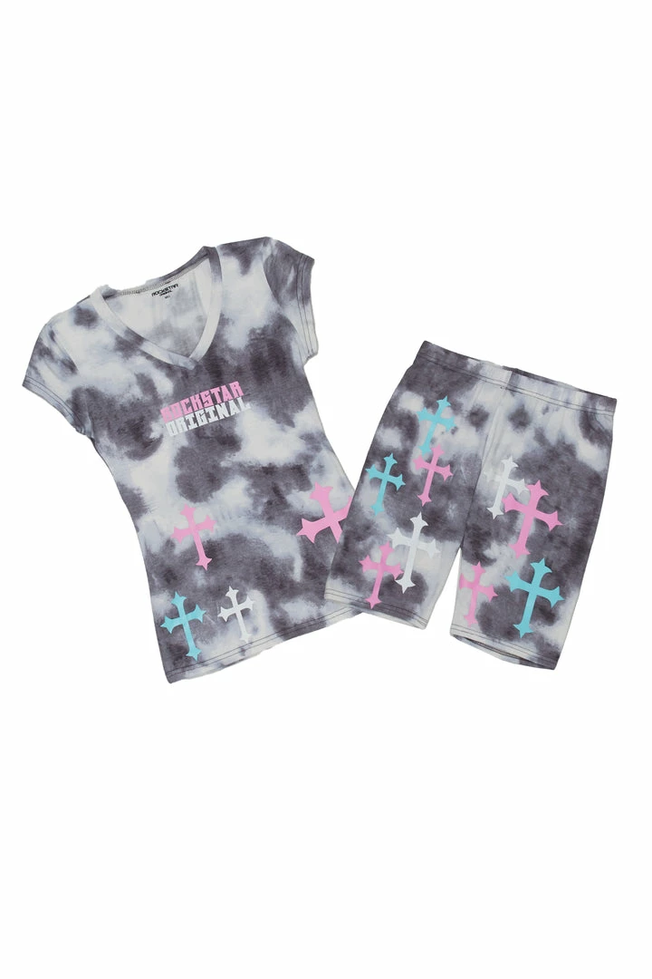 Rockstar Original Women’s two-piece short set in grey. Featuring printed multi color and RSO logos with cross graphics throughout the top and bottoms. Top accents a V-neckline with short sleeves and an oversized fit while bottoms accent a form-fitting waistband with a mid biker length. Style with sneakers for a casual but flawless Rockstar babe look.