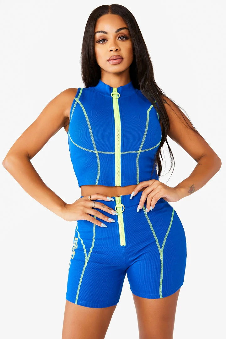 Rockstar Original Women’s bold two-piece set with zippers and contrast seams, accented with bright Rockstar Original logos.