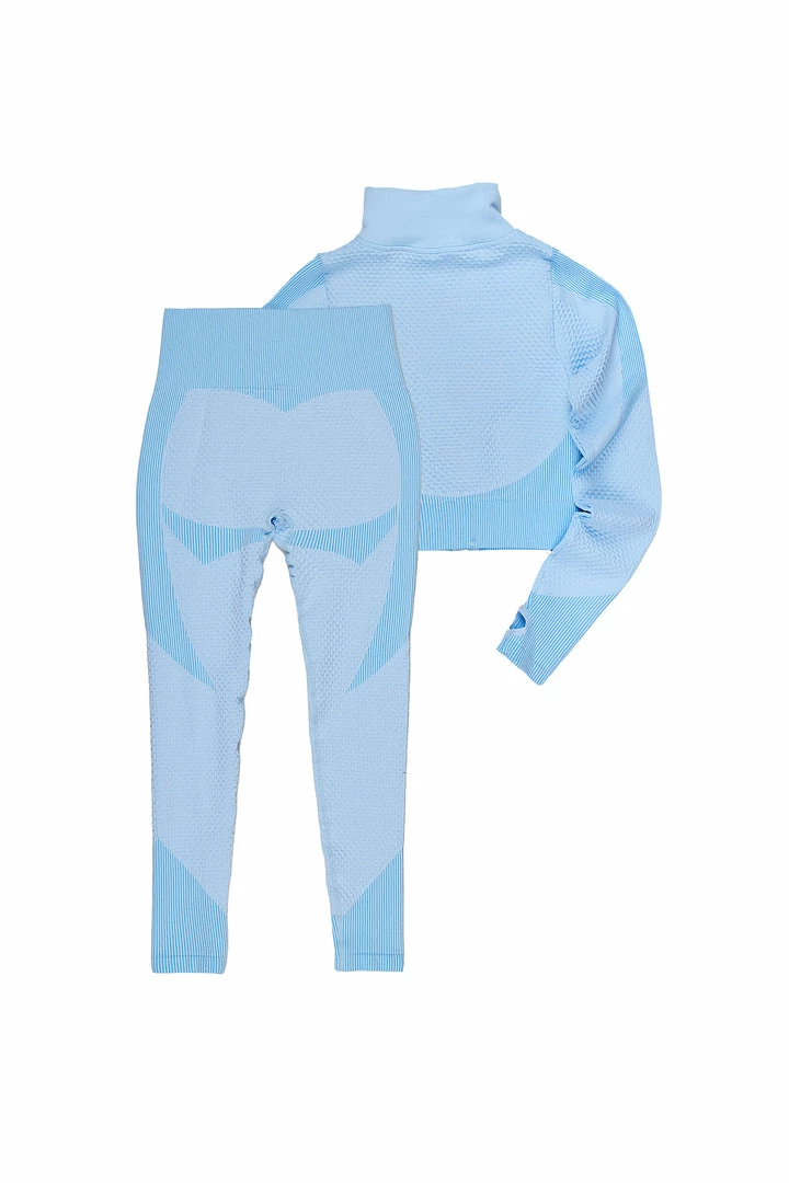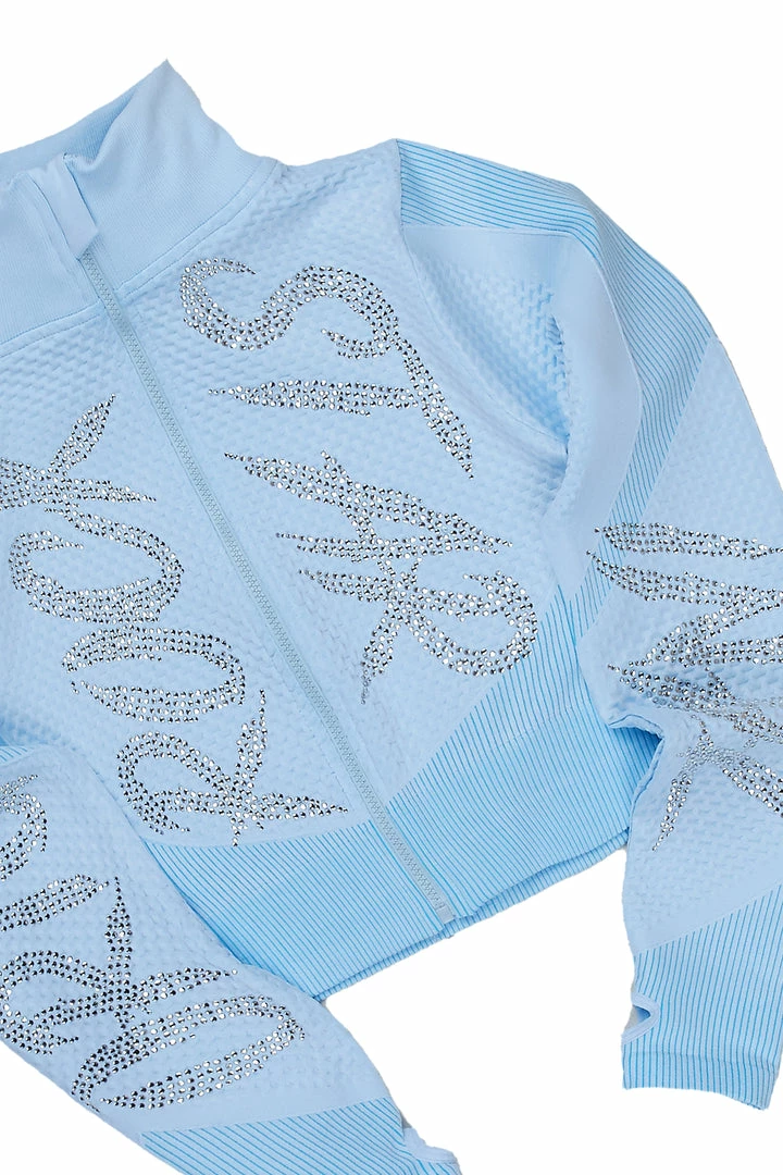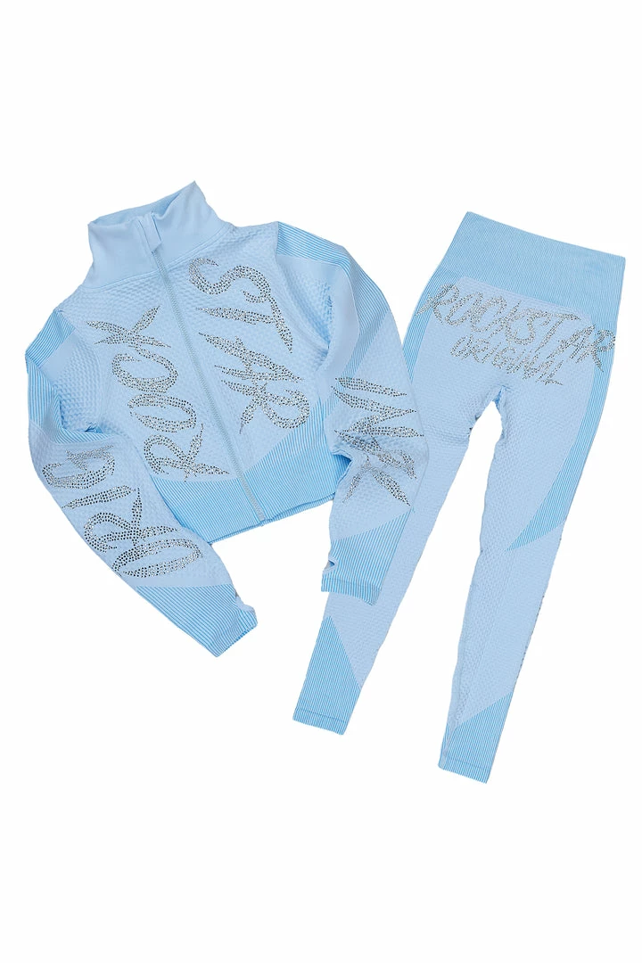 Rockstar Original Women’s two-piece tracksuit set in baby blue. Featuring rhinestone RSO logos throughout the top and bottoms. Top accents a high-quality front zipper closure withย a stand-up collarย and a cropped length. Bottoms accent a high-waisted, form-fitting silhouette with body contouring ribbed knit designing.ย
