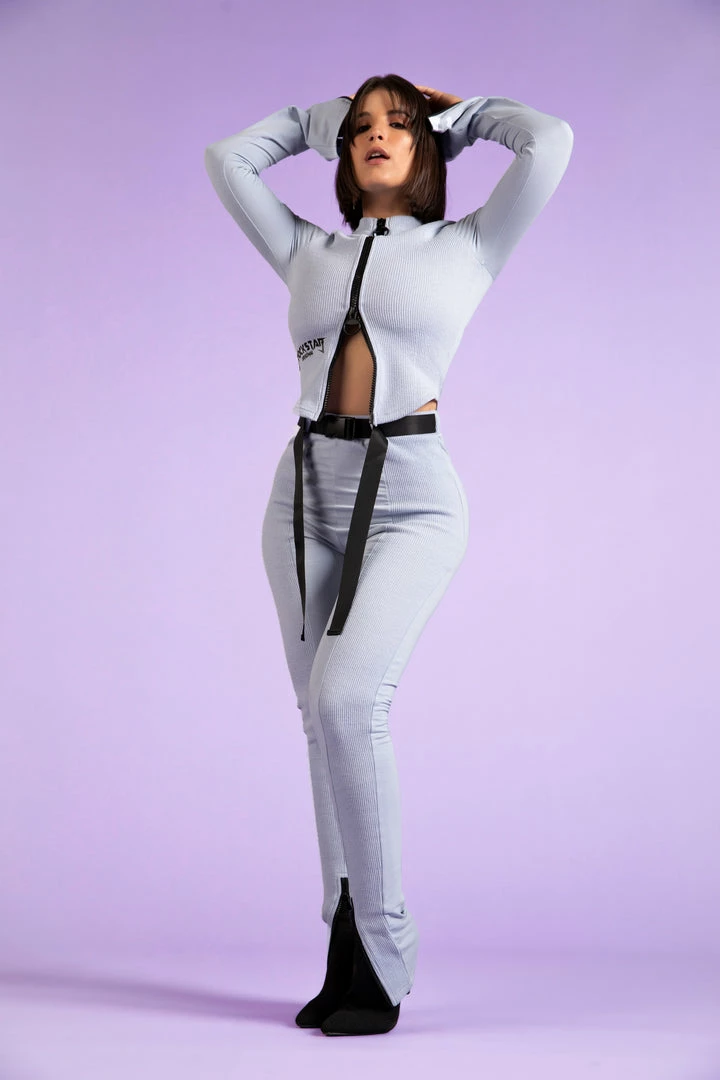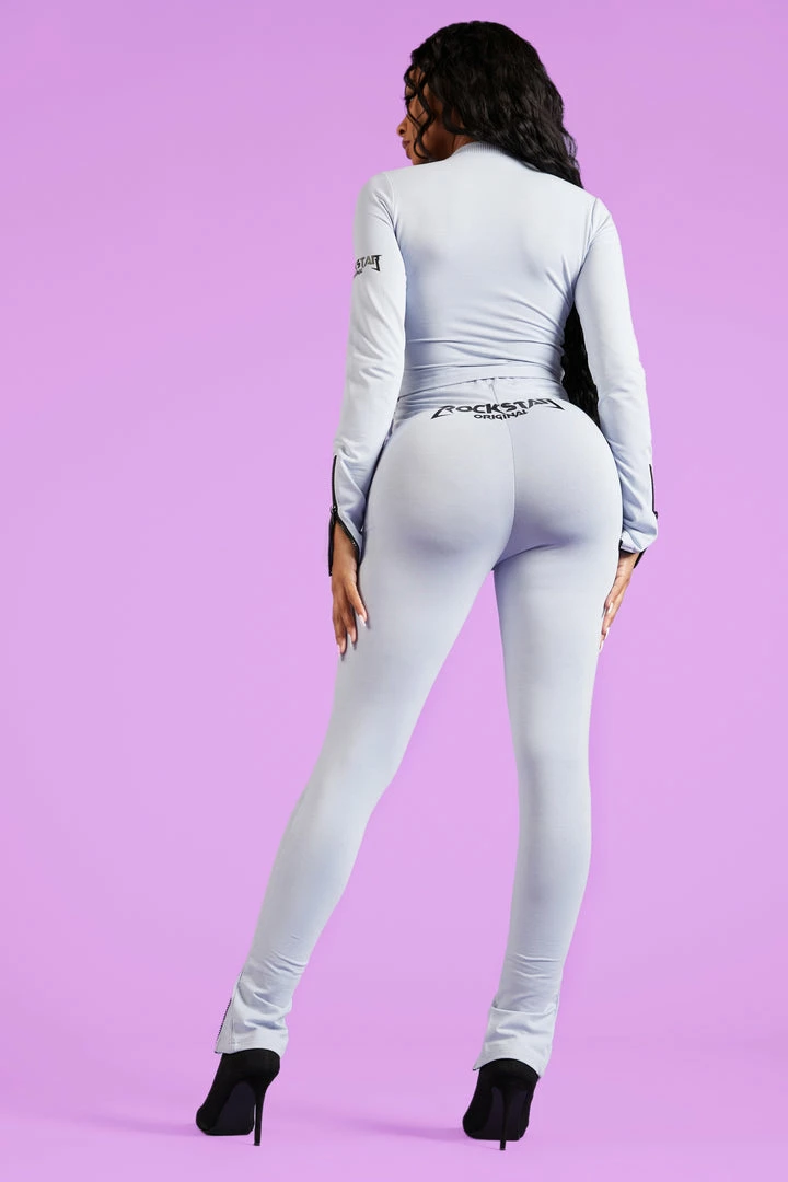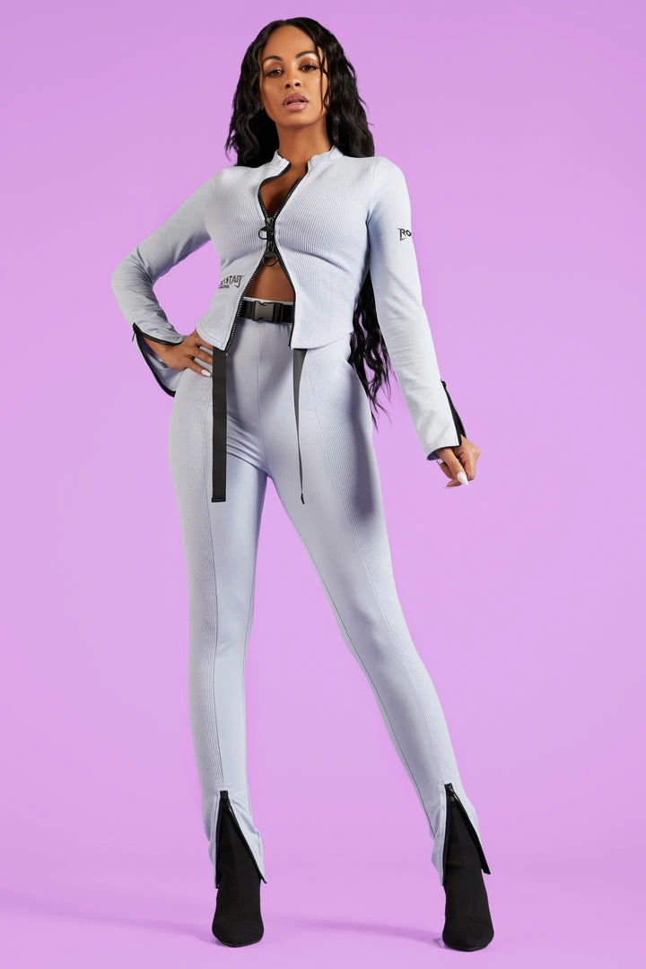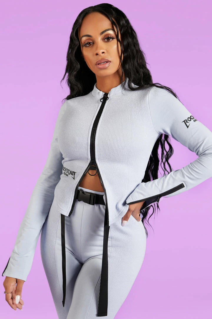 Rockstar Original Women’s grey ribbed and paneled active set with hanging belt straps, molded front zipper, curved bustier front hem and matching legging.