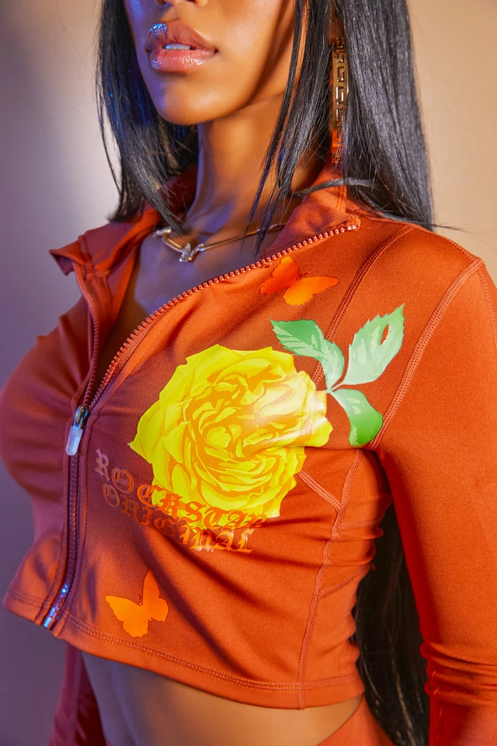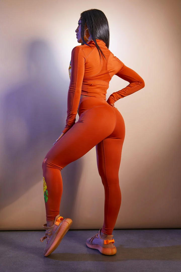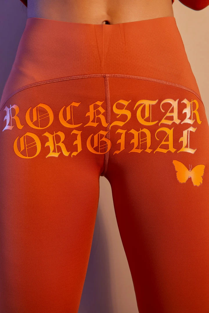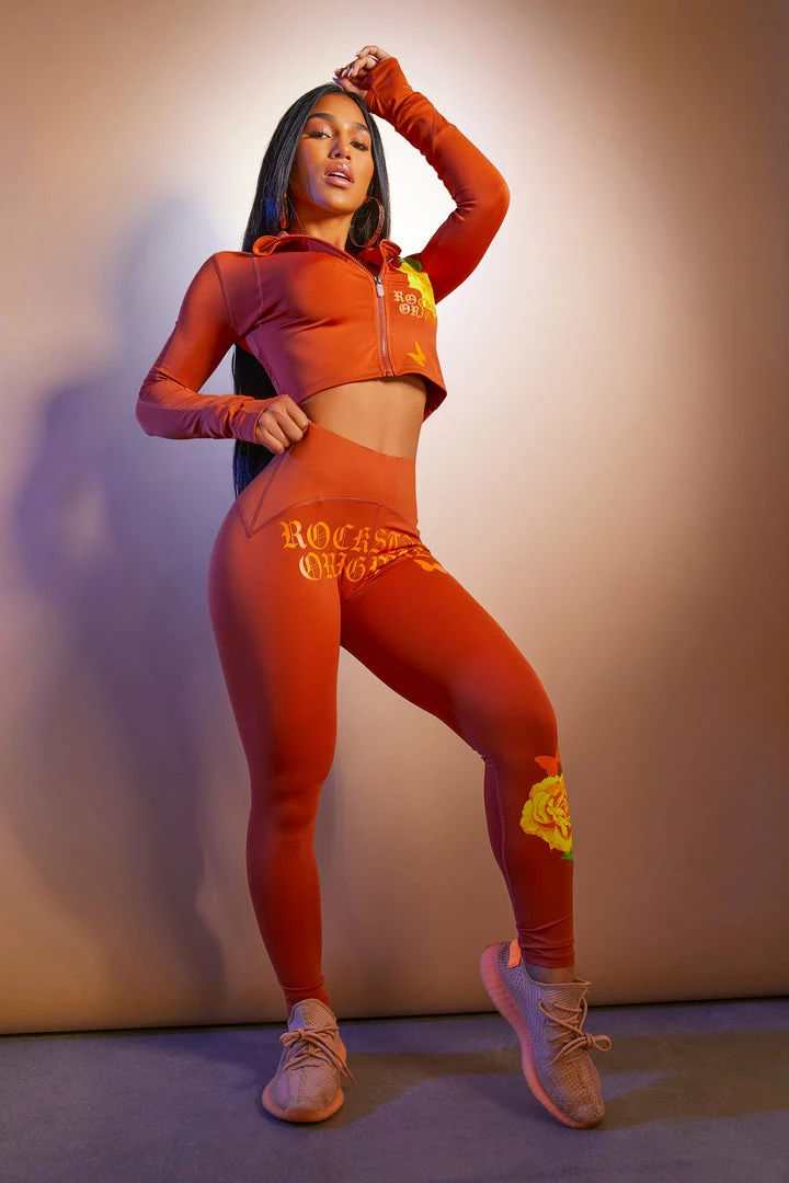 Rockstar Original Women’s two-piece active set in sweet brown. Featuring printed RSO logos with graphics to match throughout the top and bottoms. Top accents a crop length, collared neckline, thumb holes, breathable knit mesh pattern designing and a high quality front zipper closure with a secret posterior zipper pocket. Bottoms accent a tummy tuck waistband for the most alluring Rockstar babe work-out fit.