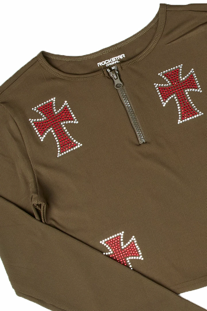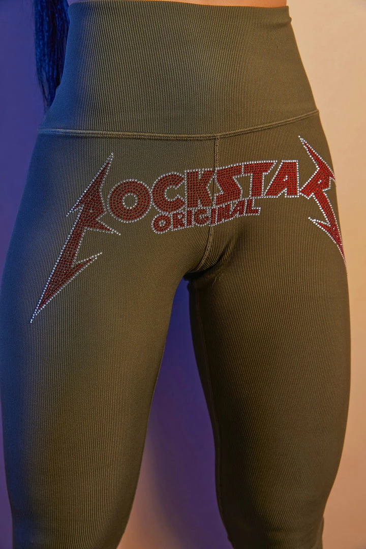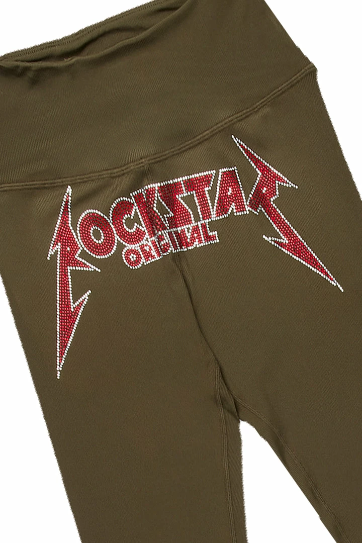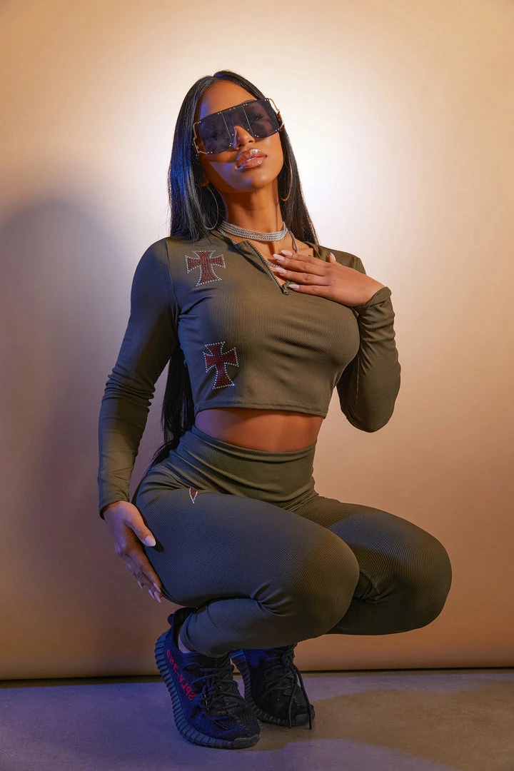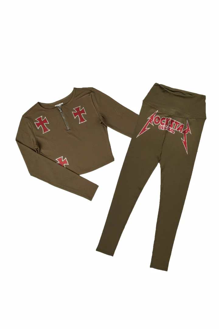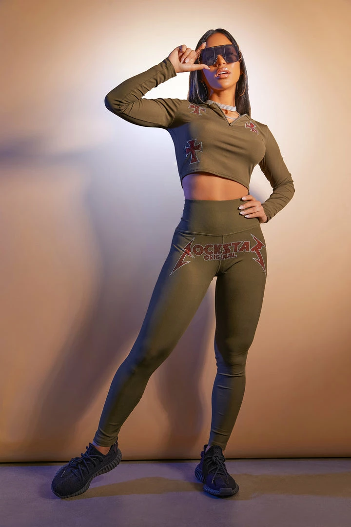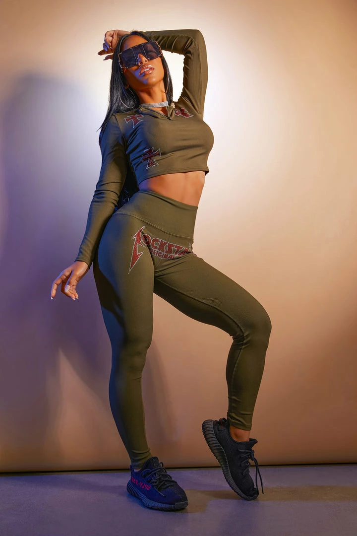 Rockstar Original Women’s two-piece active set in olive green. Featuring rhinestone RSO logos with graphics to match throughout the top and bottoms. Top accents a crop length, collared neckline, ribbed knit pattern designing and a high quality quarter zip closure. Bottoms accent aΒ high-waisted silhouette for the most alluring Rockstar babe work-out fit.Β