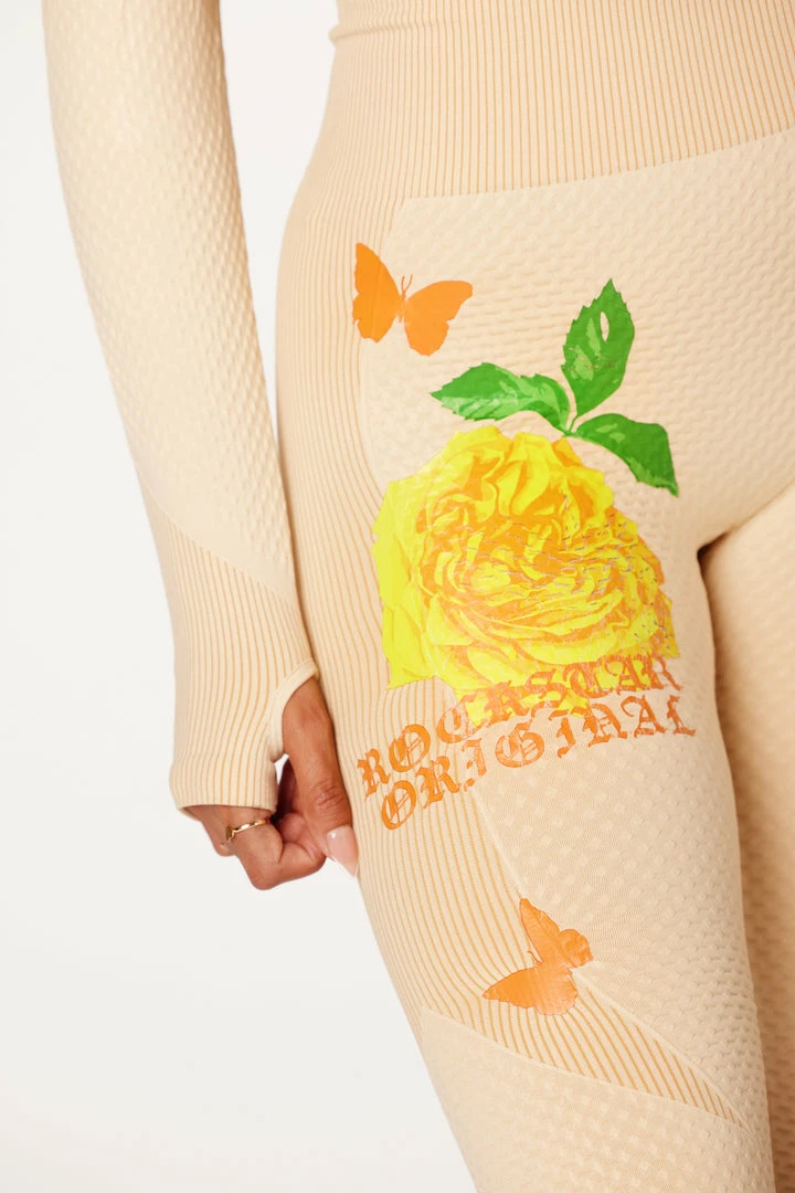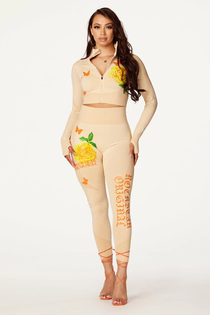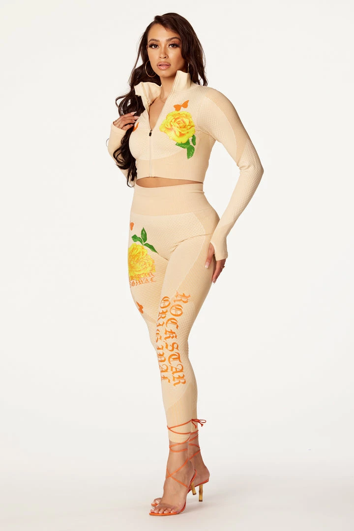 Rockstar Original Women’s two-piece active set in beige. Featuring printed RSO logos with floral graphics throughout the top and bottoms. Top accents a crop length, collared neckline, thumb holes, breathable knit mesh pattern designing and a high quality front zipper closure with a secret posterior zipper pocket. Bottoms accent a tummy tuck waistband for a flattering workout fit.