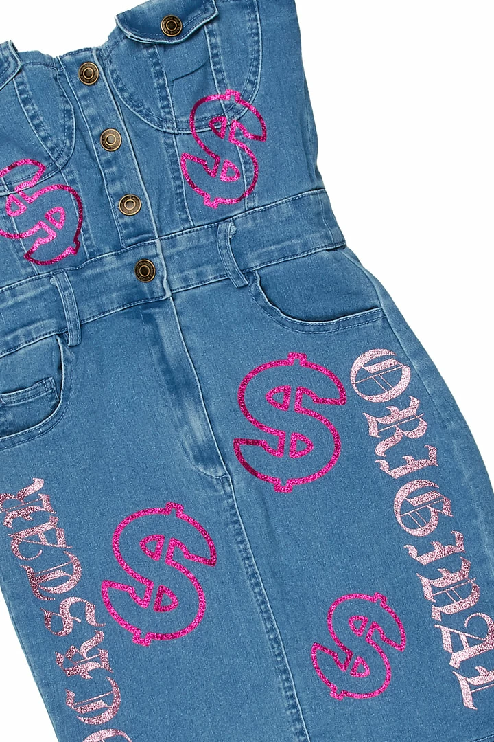Rockstar Original Women’s denim dress in medium wash. Featuring a printed RSO logo with money sign graphics throughout. Accenting a strapless, bodycon design with a front button closure and belt loops to match. Style with nude heels for a gorgeous Rockstar babe ‘fit!