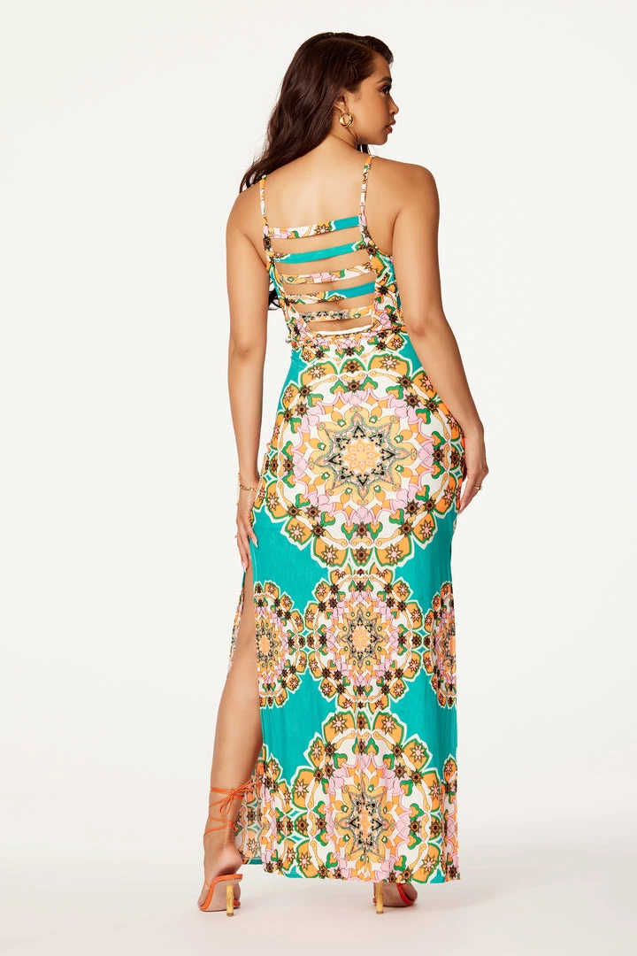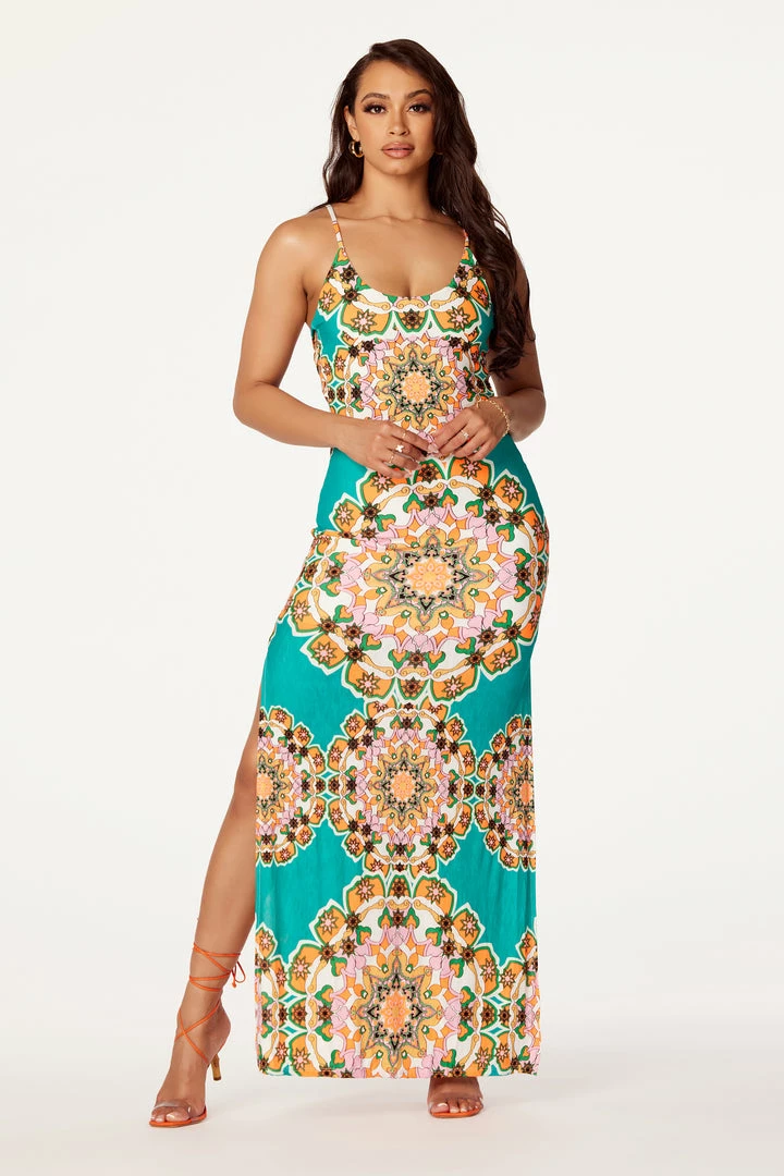 Rockstar Original Women’s dress in multi color print. Featuring a scoop neckline with skinny straps. Accenting high split hems on the sides with a midi length and a form-fitting silhouette. Style with nude heels for a gorgeous Rockstar babe look.