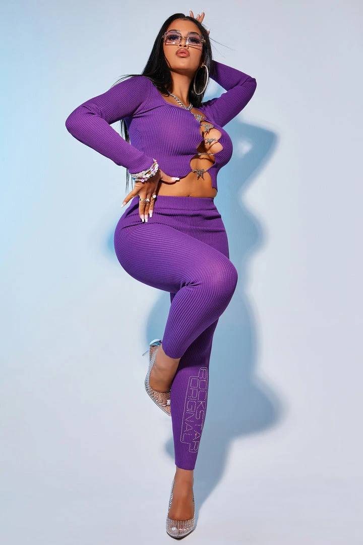 Rockstar Original Women’s two-piece tracksuit set in powerful purple. Featuring long sleeves with a rhinestone RSO on the arm, a square neckline and sparkling embellished butterfly chain closure. Bottoms feature a rhinestone RSO logo at the hem. Stay comfy and on point and with this must-have ensemble!