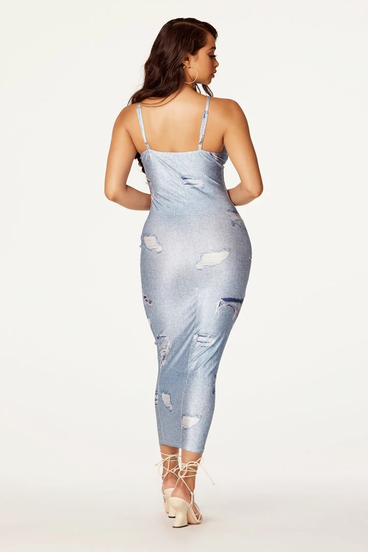 Rockstar Original Women’s midi dress in light wash denim blue. Featuring a halter top style strap with cut-out patterns on the front. Designedย distressed detailing throughout and a form-fitting silhouette.