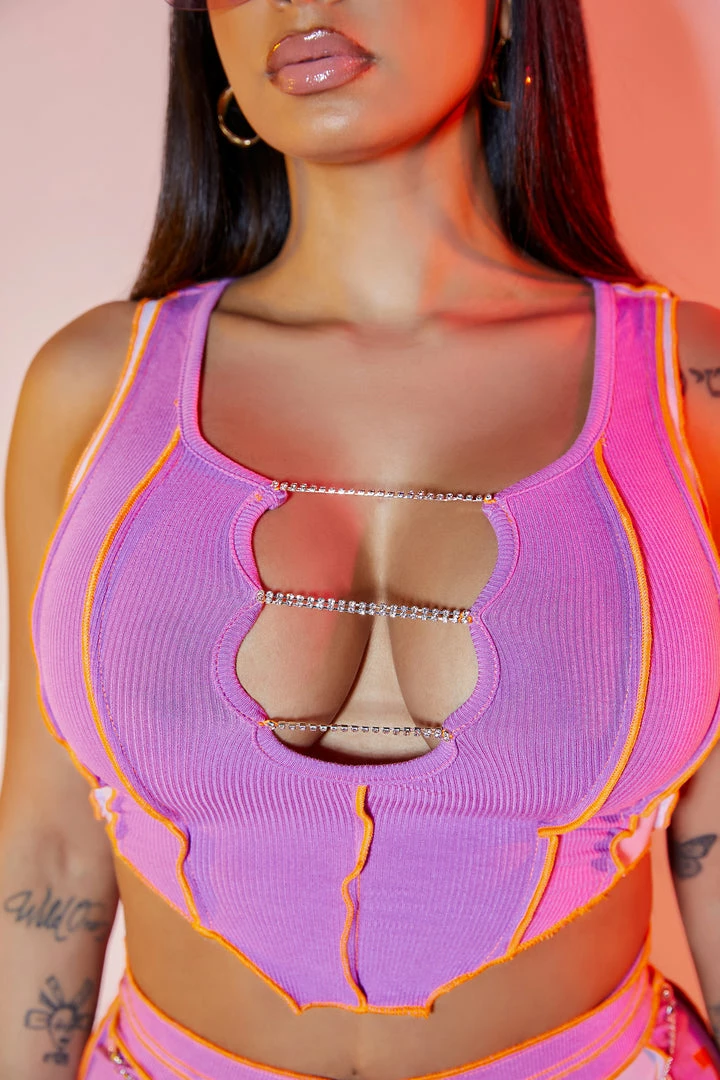 Rockstar Original Women’s two-piece skirt set in lavender. Featuring printed RSO logos on the top and bottom with rib knit fabric and contrast exposed seams throughout. Top accents a keyhole neckline with embellished chain detailing while skirt accents a v-waistline with a mini length and embellished chain across the front. Style with strappy heels for a gorgeous daytime look!