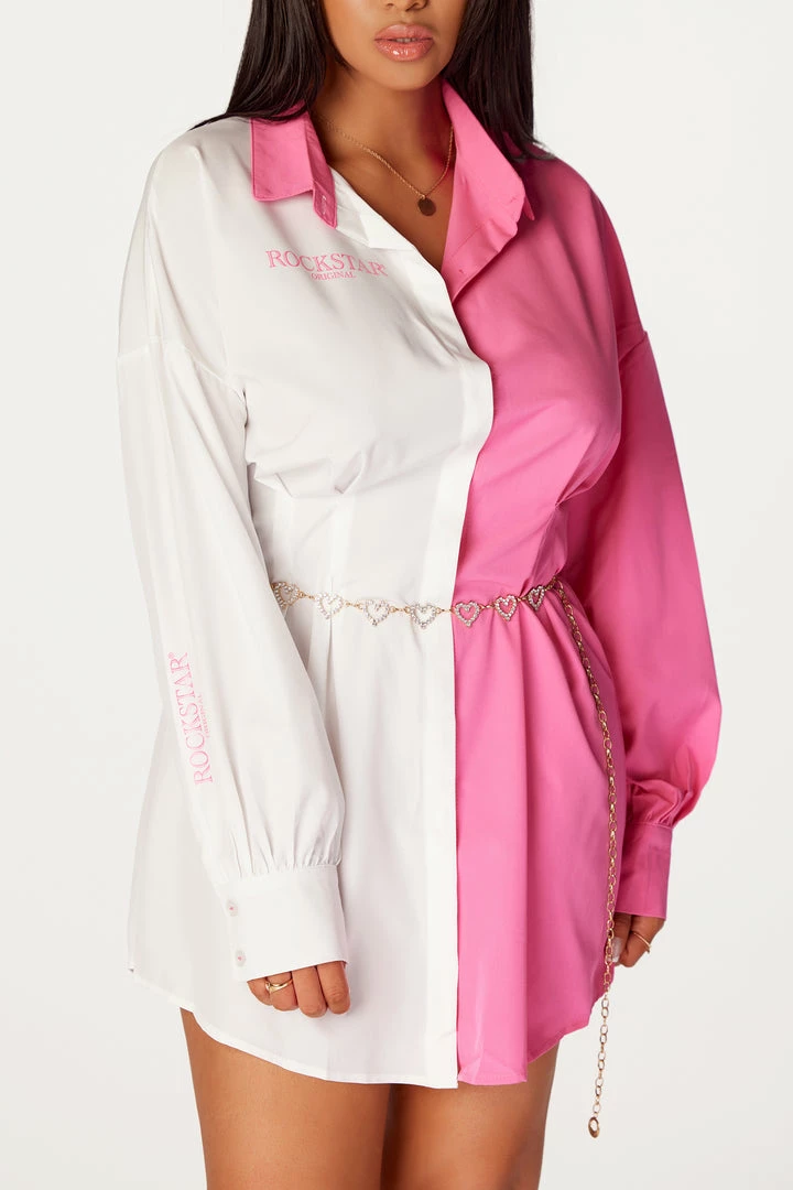 Rockstar Original Women’s dress in pink and white. Featuring a split color block design with long sleeves. Accenting a collared neckline with a front button placket, cinched waistline and loose hem.
