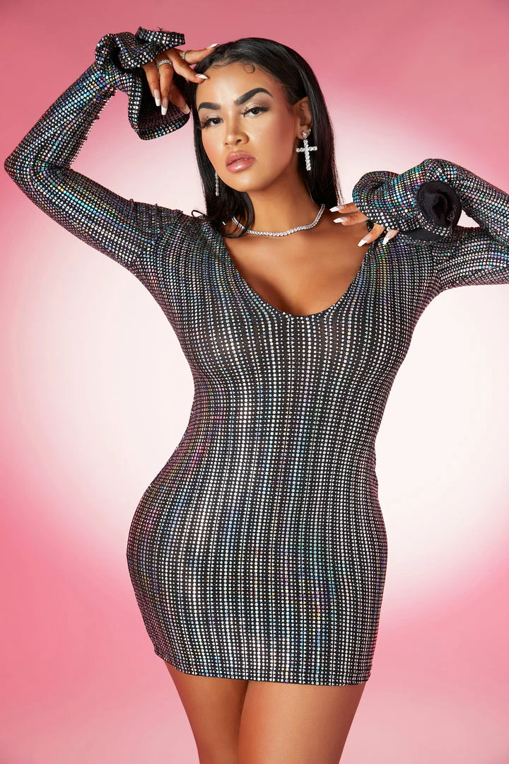 Rockstar Original Women’s bodycon dress in shimmering silver. Featuring a deep plunge v-neckline withย long sleeves. This must-have ensemble is styled with a mini length and a gorgeousย sequinย finish for the perfect combo of sexy andย extravagant!
