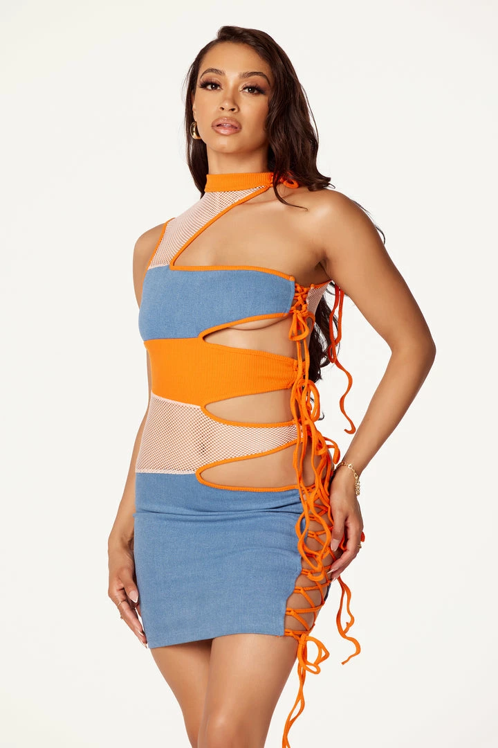 Rockstar Original Women’s dress in multi color. Featuring a printed RSO logo above the hem and a cut-out pattern throughout with a multi pattern fabric finish. Accenting a turtle neckline with a one-shoulder design and a side-tie to match with a mini length.