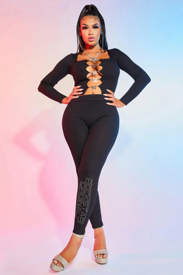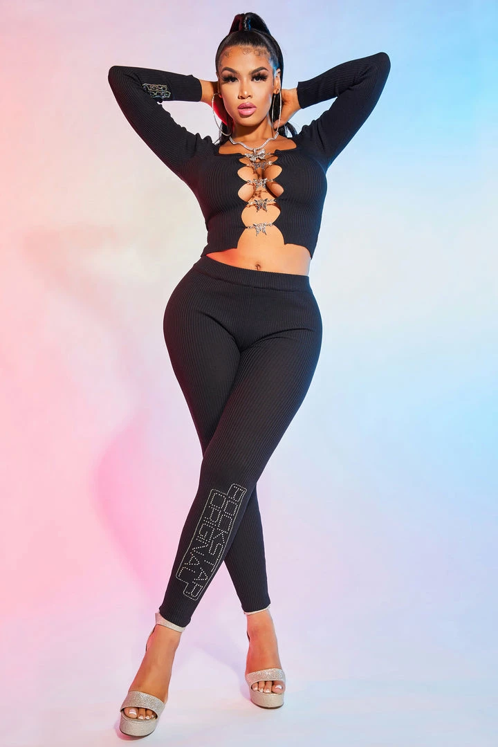 Rockstar Original Women’s two-pieceย tracksuitย set in boss babe black. Featuring long sleeves with a rhinestone RSO on the arm, aย squareย necklineย andย sparkling embellishedย butterfly chain closure. Bottoms feature a rhinestone RSO logo at the hem.ย Stay comfy andย on pointย andย with this must-have ensemble!