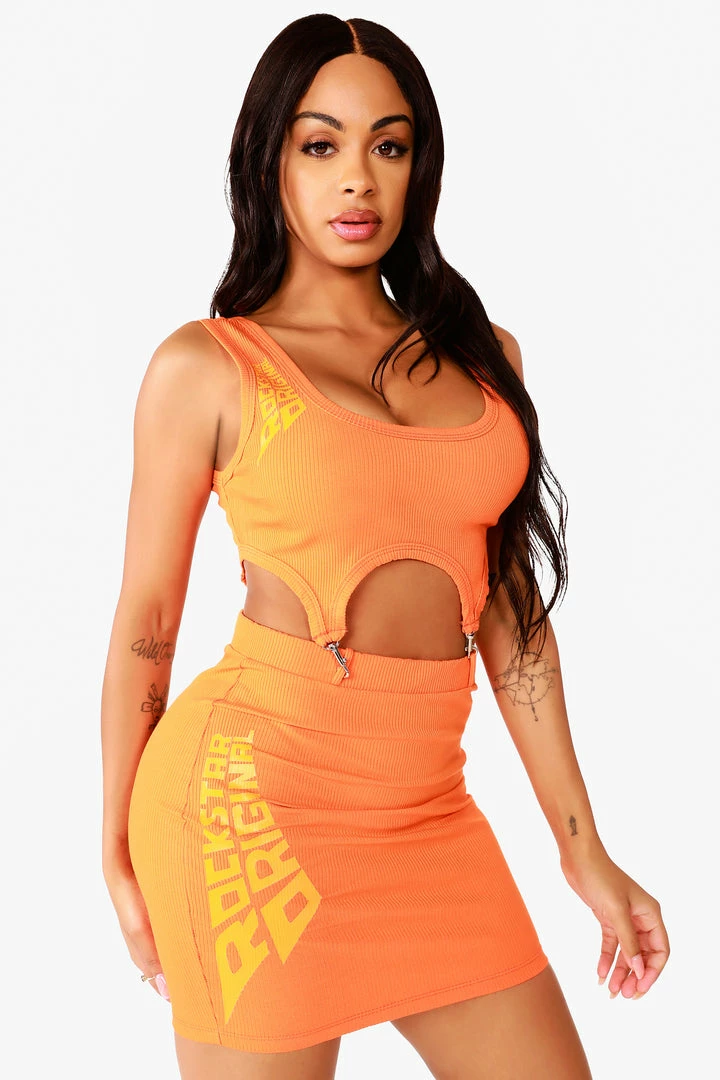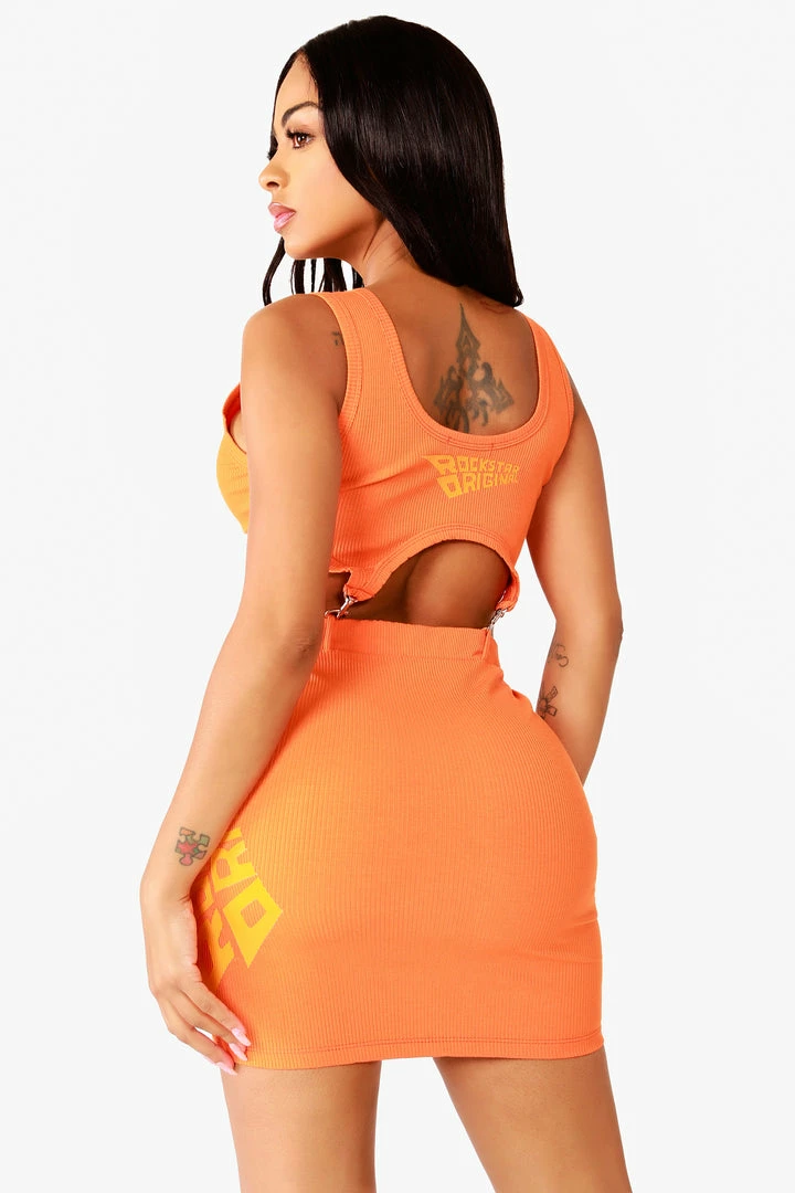 Rockstar Original Women’s mini dress with metal clips at the waist and bold Rockstar Original curved logos.