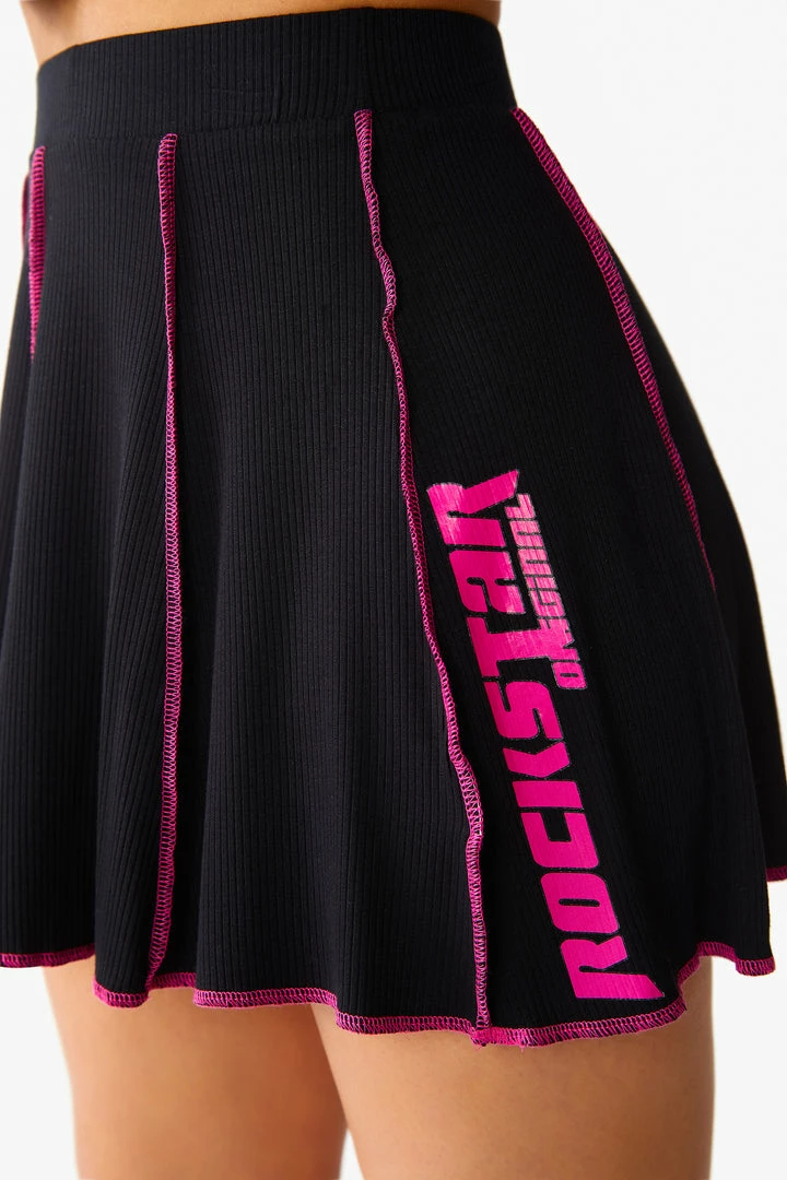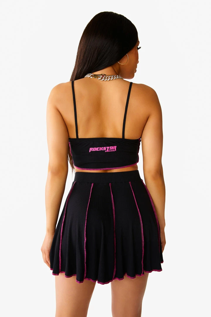 Rockstar Original Women’s spaghetti-strap crop padded bodice top with flowy paneled skirt in ribbed jersey with contrast overlock style lines in contrast thread. RSO logos accent the front and back of the skirt.