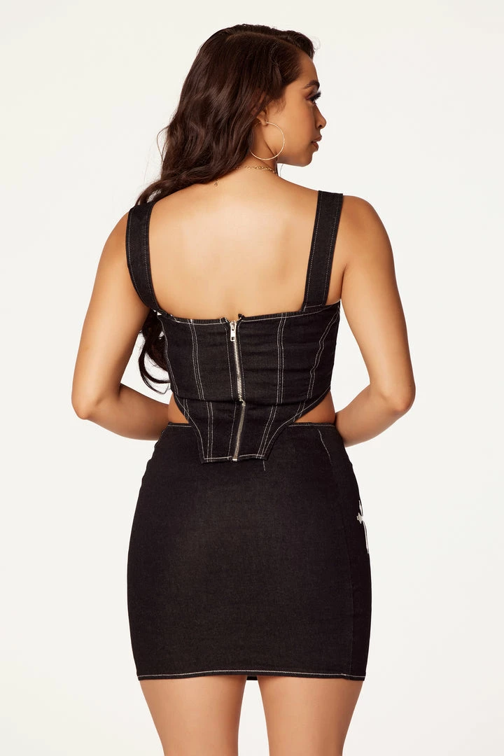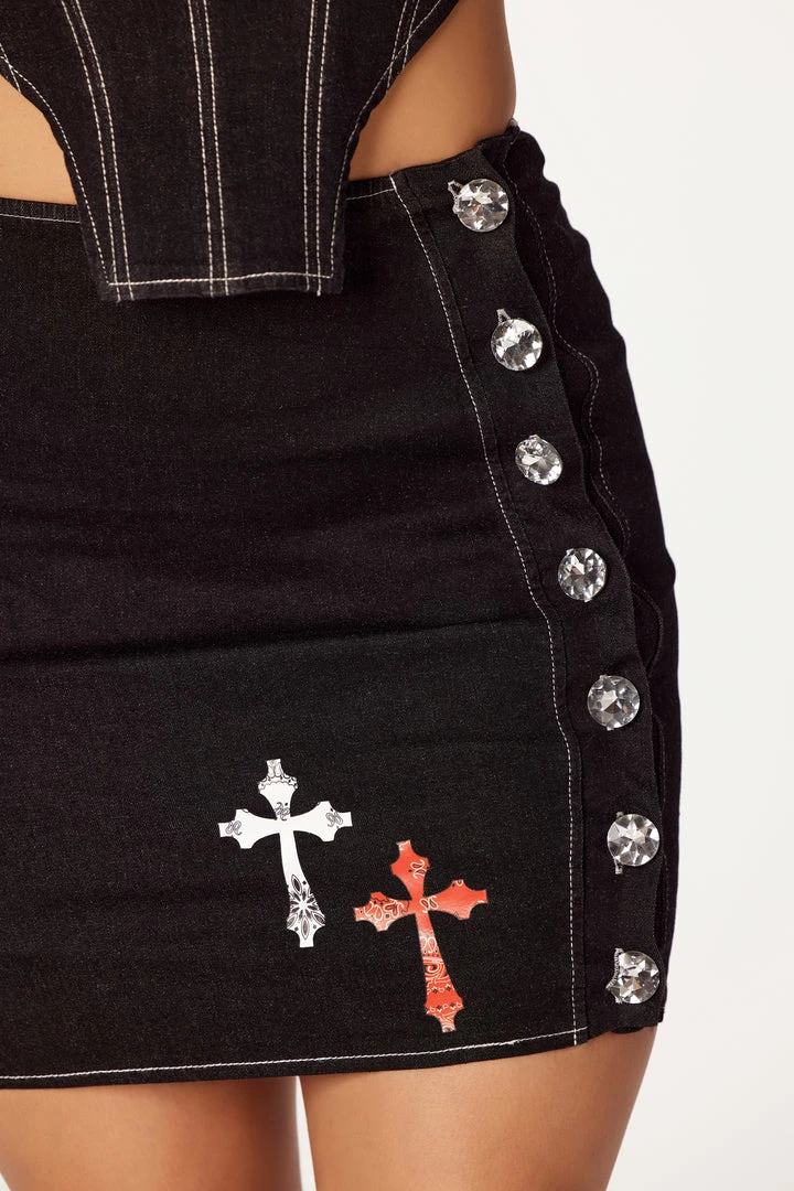 Rockstar Original Women’s two-piece denim skirt set in black. Featuring a printed RSI logo on the top with cross graphics on the skirt. Top accents a straight neckline with thick straps, a patterned, cropped hem and a posterior zipper closure. Skirt accents a side diamond button closure with a mini length and a form-fitting silhouette,