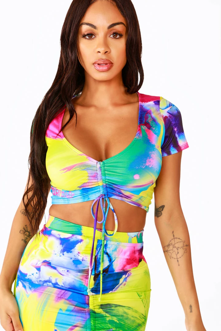 Rockstar Original Women’s sexy watercolor printed short-sleeved cinched top with a mini cinched skirt and bright pink Rockstar Original logos.