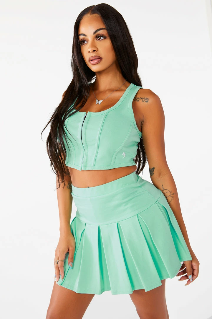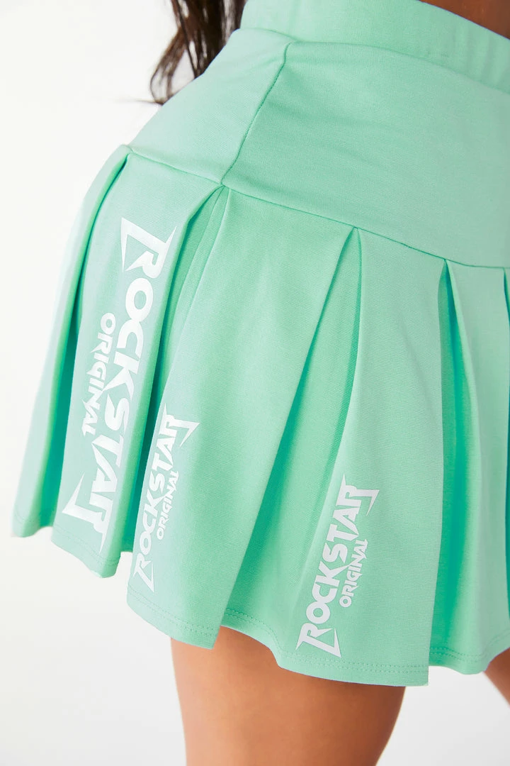 Rockstar Original Women’s two-piece corset tank top and cheerleader paneled skirt set with bold Rockstar Original logos.