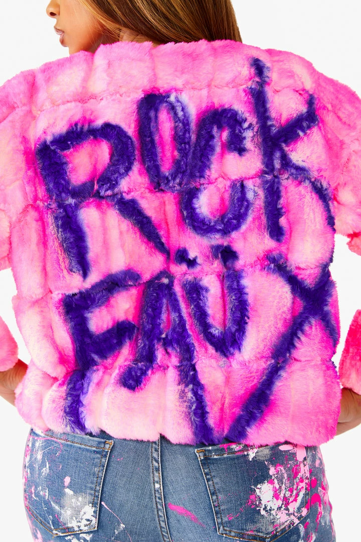Rubi Rose x Rockstar Original Women’s fitted faux fur jacket in poppin’ spray paint pink will make you the center of all the attention! Featuring custom spray painted “Rock Faux” graffiti writing in deep purple — make a statement and slay all day, Rockstar babes!
