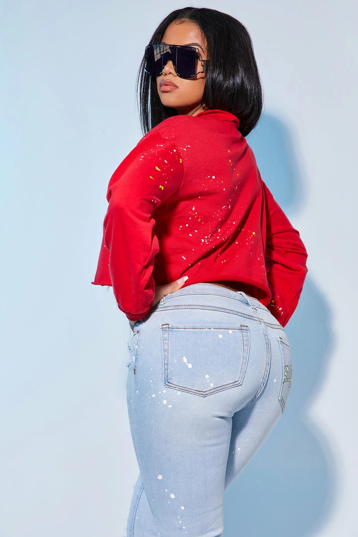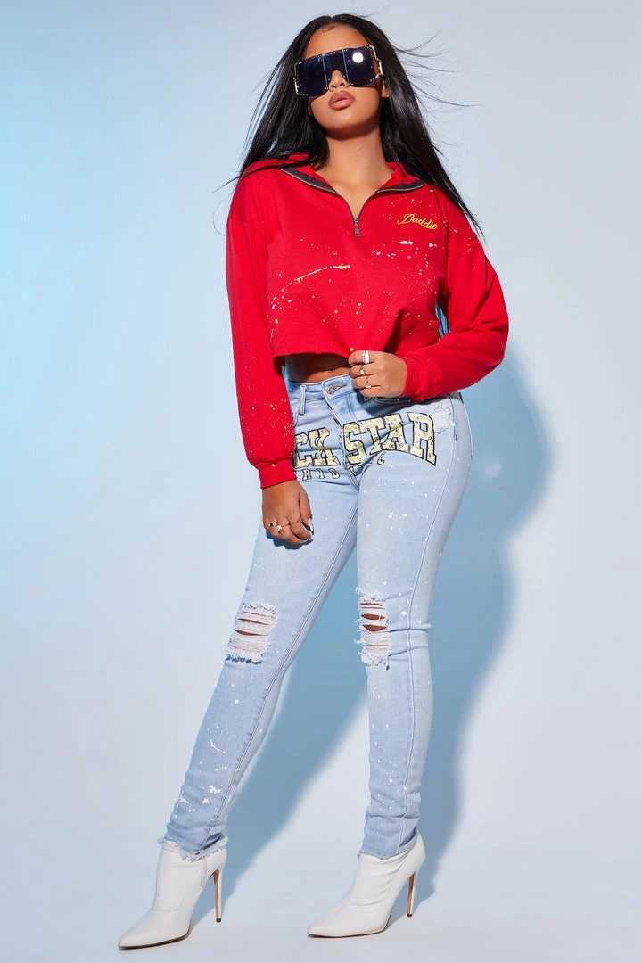 Rockstar Original Women’s sweatshirt in red. Featuring aย embroidered Baddie logo on the chestย and a half zip collar. Accenting a crop length, elastic cuffs and premium cotton threading for style and all day comfort. Style with your favorite pair of denim jeans and booties!