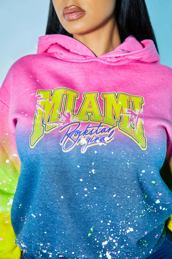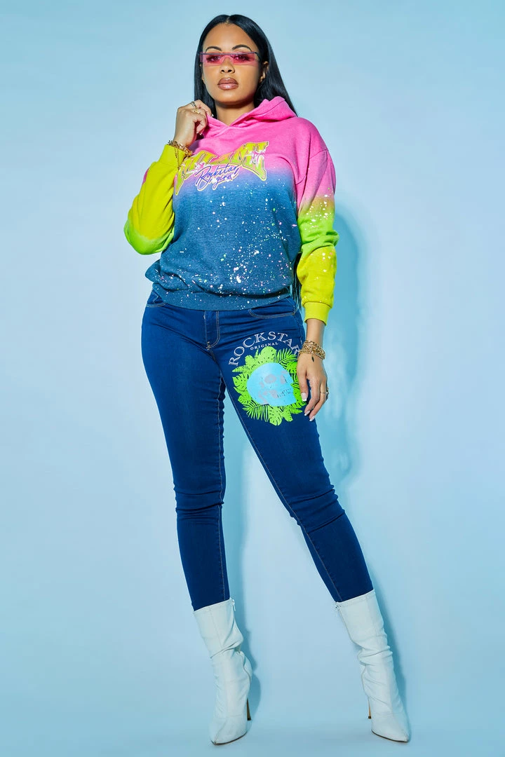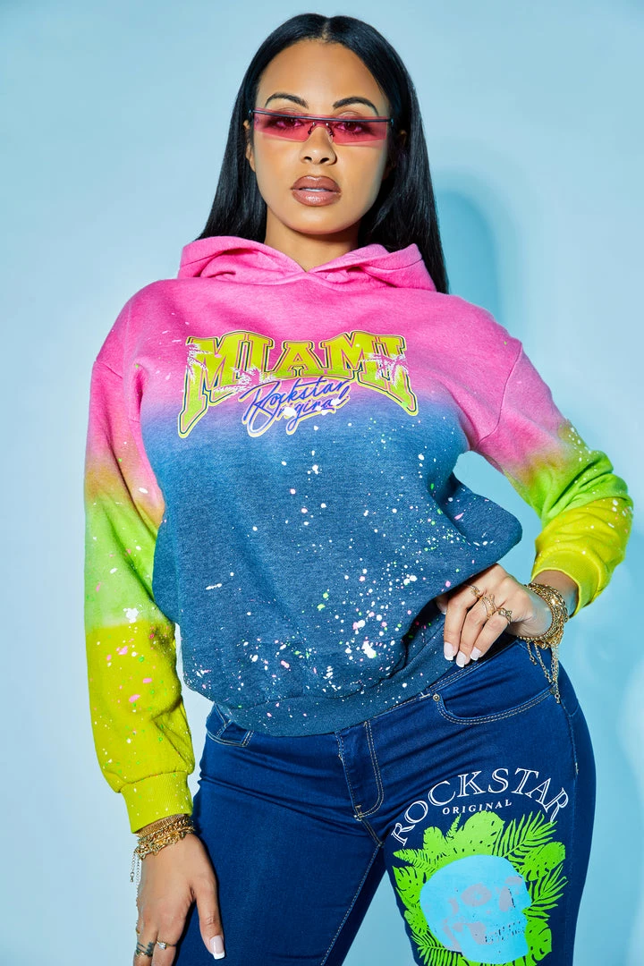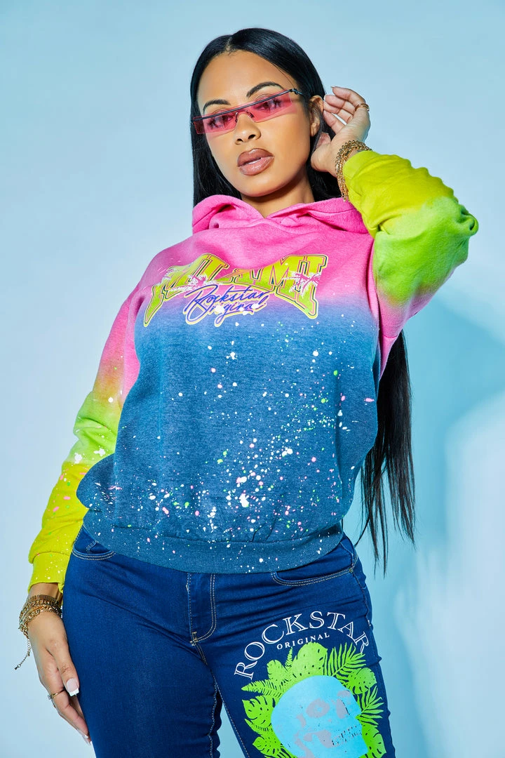 Rockstar Original Women’s multi color hoodie. Featuring a printed RSO logo with a Miami logo to match and custom splatter paint throughout. This gorgeous hoodie accents a relaxed fit with cuffed hems and premium cotton threading for the ultimate cozy vibes!