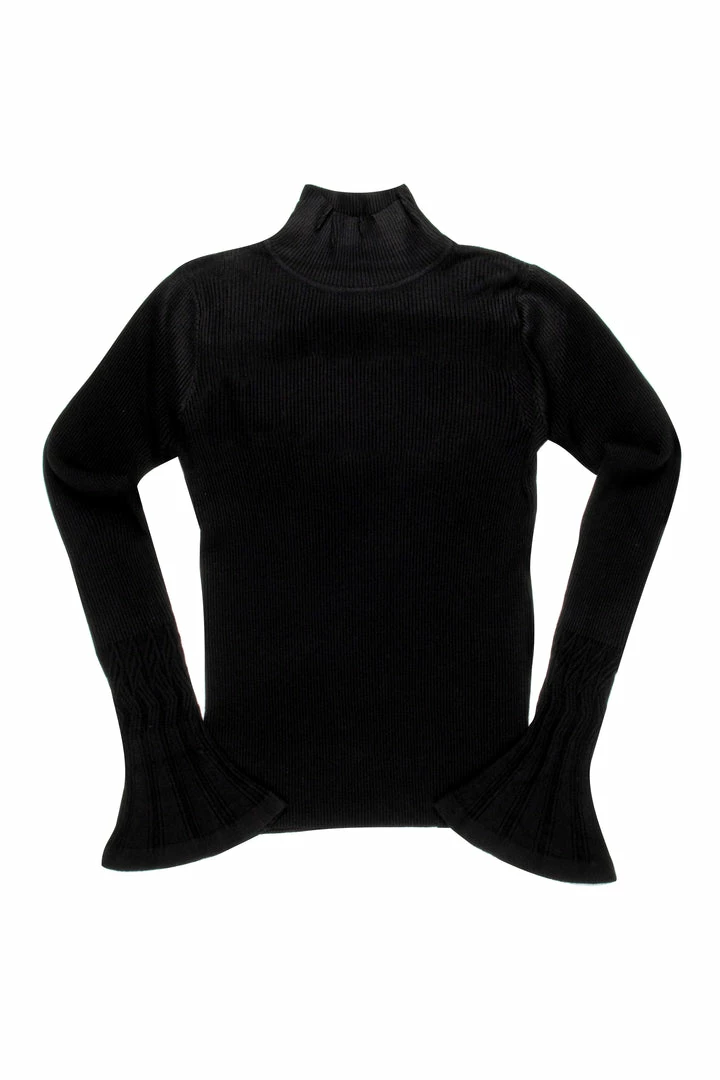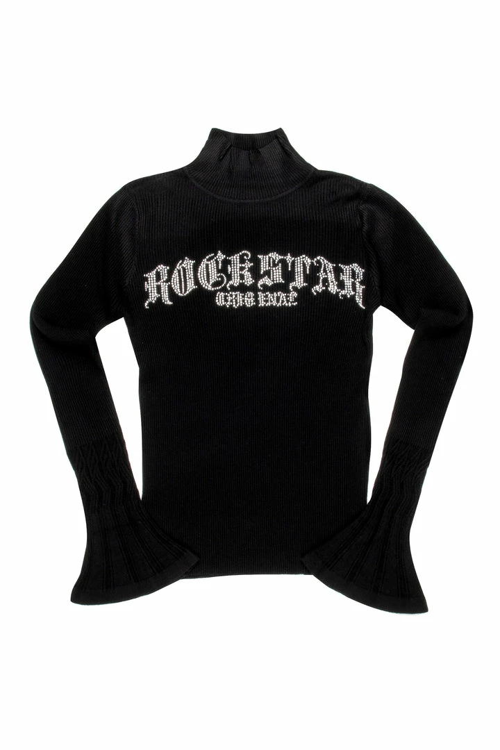 Rockstar Original Women’s turtleneck in black. Featuring a rhinestone RSO logo across the bust with a form-fitting silhouette and long bell hem sleeves. Style with your favorite black jeans or mini skirt with booties for the most alluring Rockstar babe fit.
