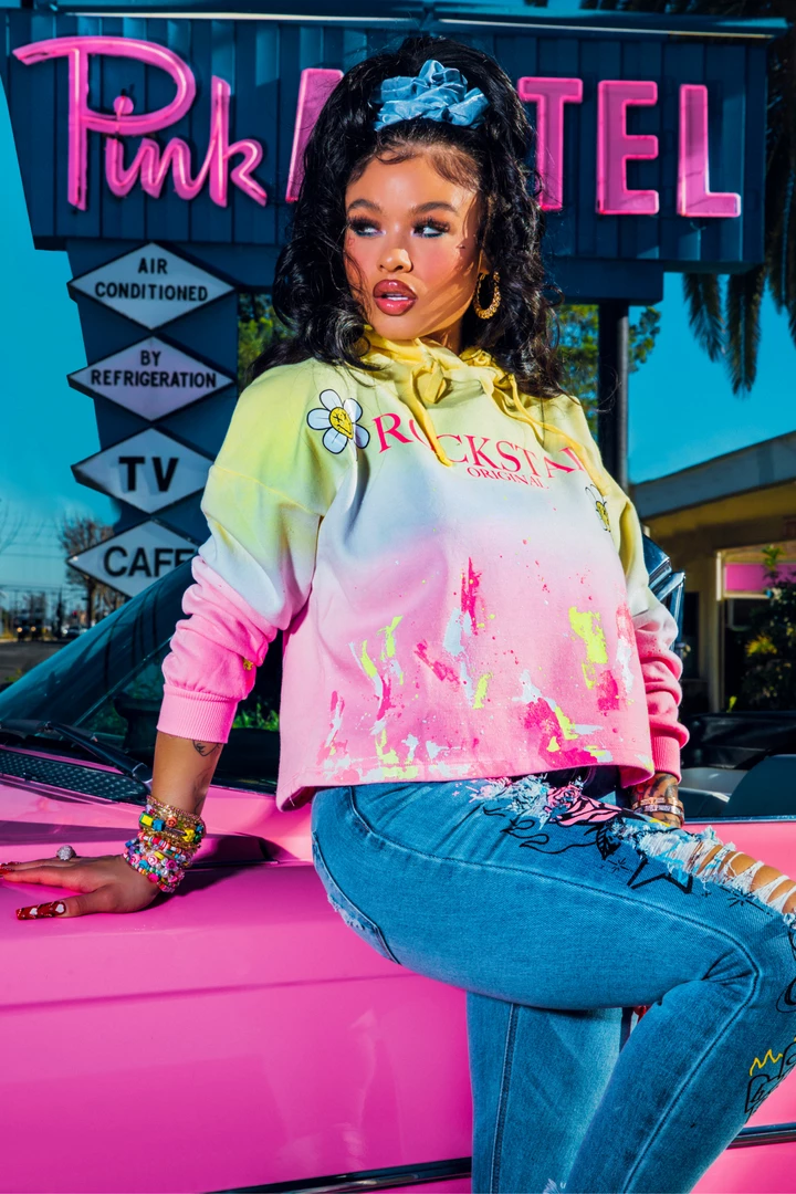 India Love in Rockstar Original Women’s tie-dye hoodie in yellow. Featuring a printed RSO logo with graphic printed smiley face daisies and custom splatter paint detailing throughout. Accenting a drawstring hood, crop top length with ribbed cuffs and premium cotton threading for style and all day comfort.
