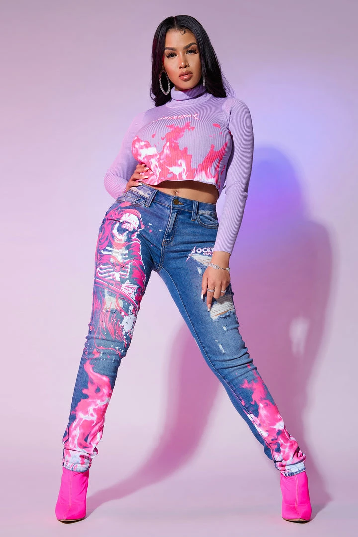 Rubi Rose x Rockstar Original Women’s long sleeve turtleneck in lovely lavender. Featuring a form fitting yet relaxed fit for maximum versatility. Accenting a bold RSO logo with matching flame designing for that extra hint of heat in your OOTD! Style with deepest black jeans and a nude heel for the most alluring Rockstar babe fit.
