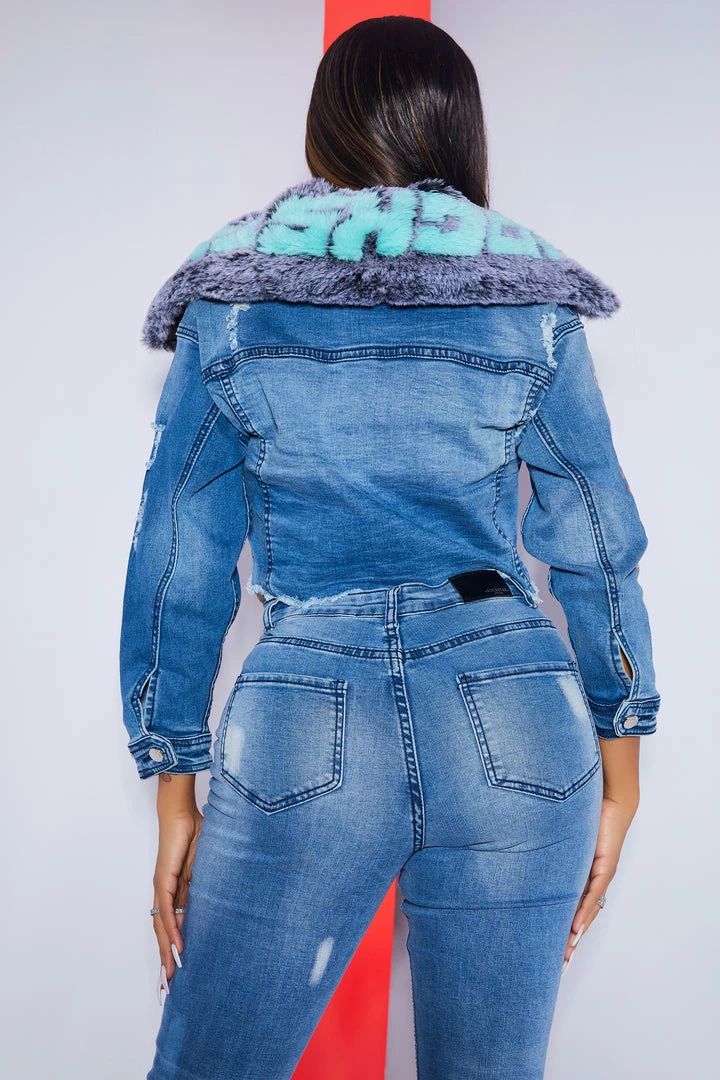 Rockstar Original Women’s medium wash denim jacket. Featuring a RSO logo with stunning hand placed patches and a two-tone removable faux fur collar. Turn heads in this one-of-a-kind baddie vibes only denim jacket this season!