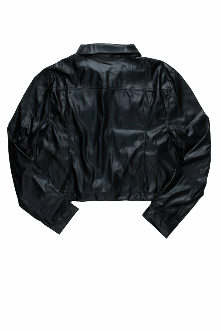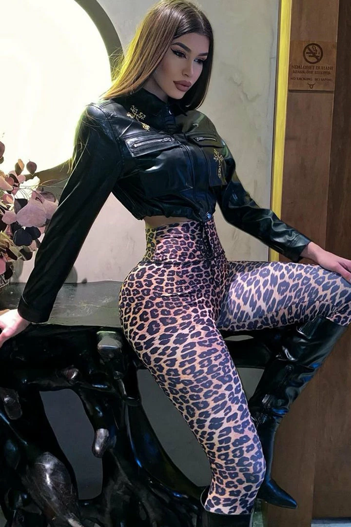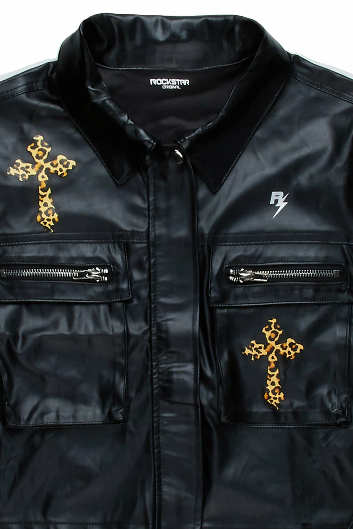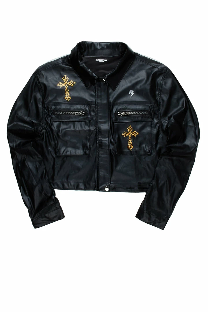 Rockstar Original Women’s faux leather jacket in midnight black. Featuring a crop length with a high quality front zipper closure and waist tie accent. This gorgeous staple piece accents printed leopard graphics throughout and zipper coin pockets for an added touch of sass!
