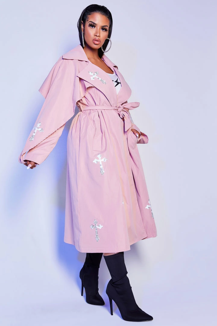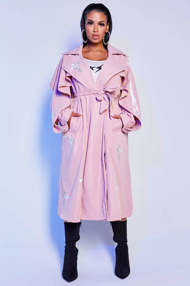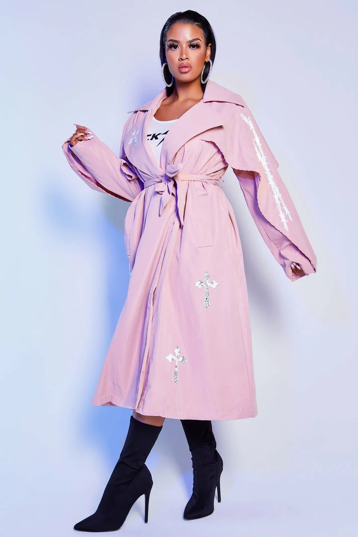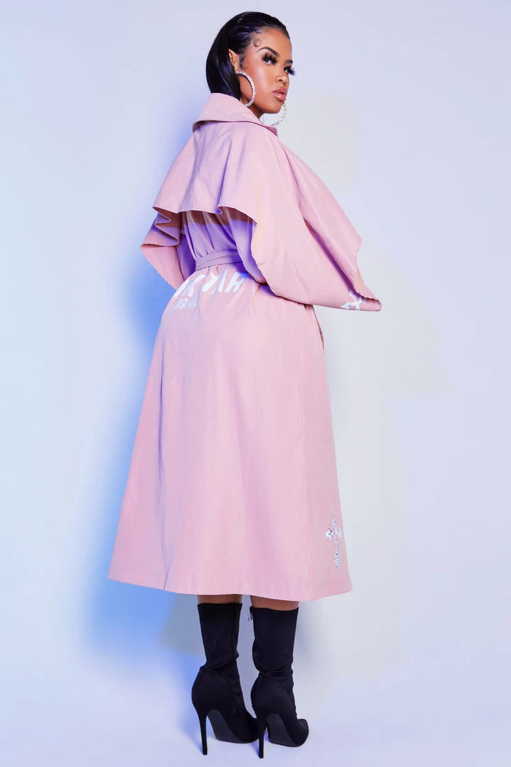 Rockstar Original Women’s trench coat in natural pink. Featuring printed RSO logos and cross graphics throughout. Accenting an elegant oversized collar with a front button closure and wide belt front tie. Style with your favorite little black dress or matching skirt set for the most alluring Rockstar babe outfit!