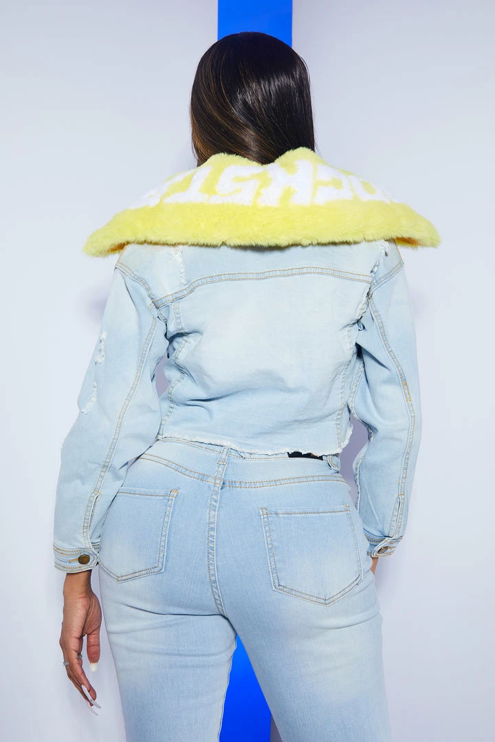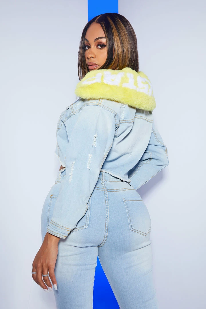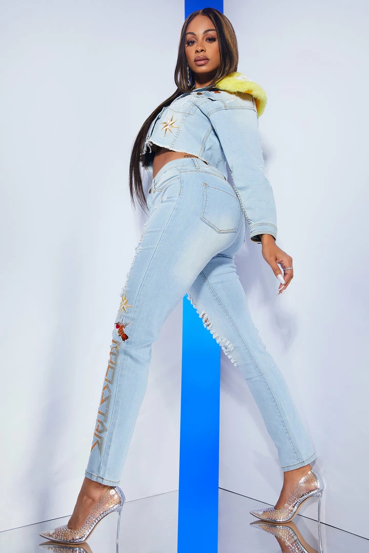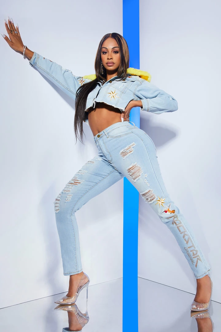 Rockstar Original Women’s lightΒ wash denim jacket. Featuring a rhinestone RSO logo with stunning hand placed patchesΒ and a two-tone removable faux fur collar. Turn heads in this one-of-a-kind baddie vibes only denim jacket this season!