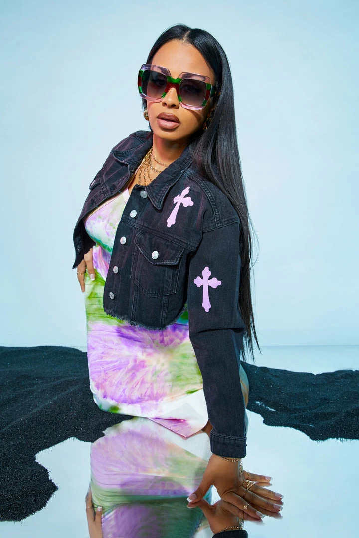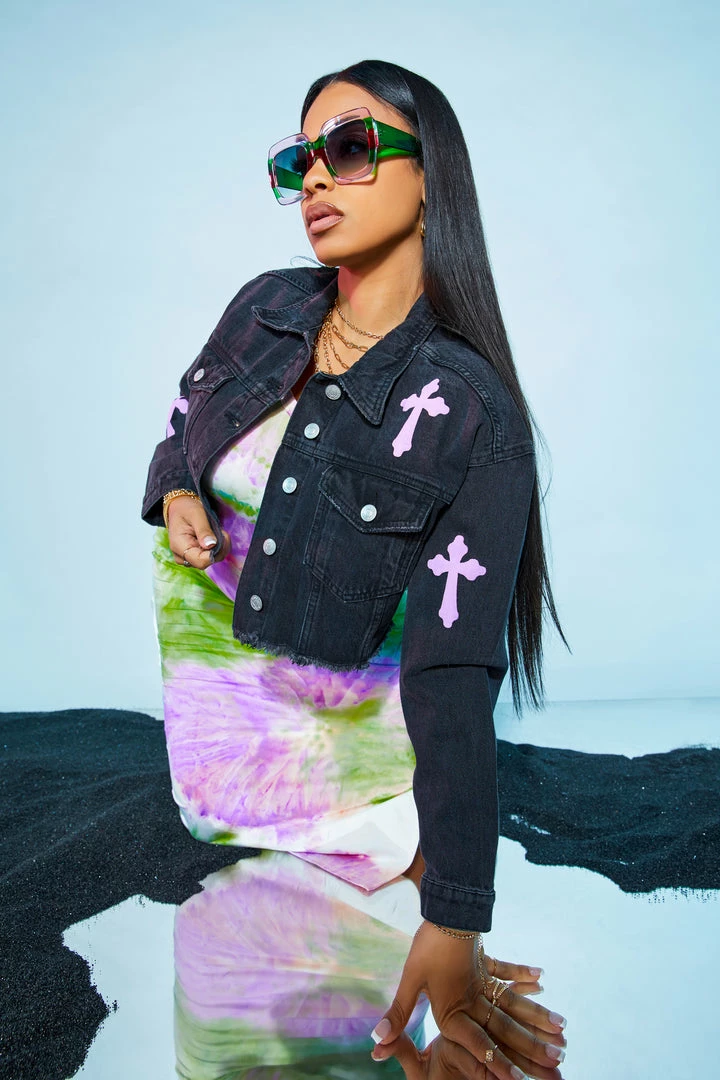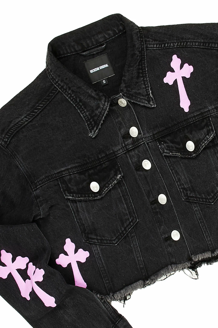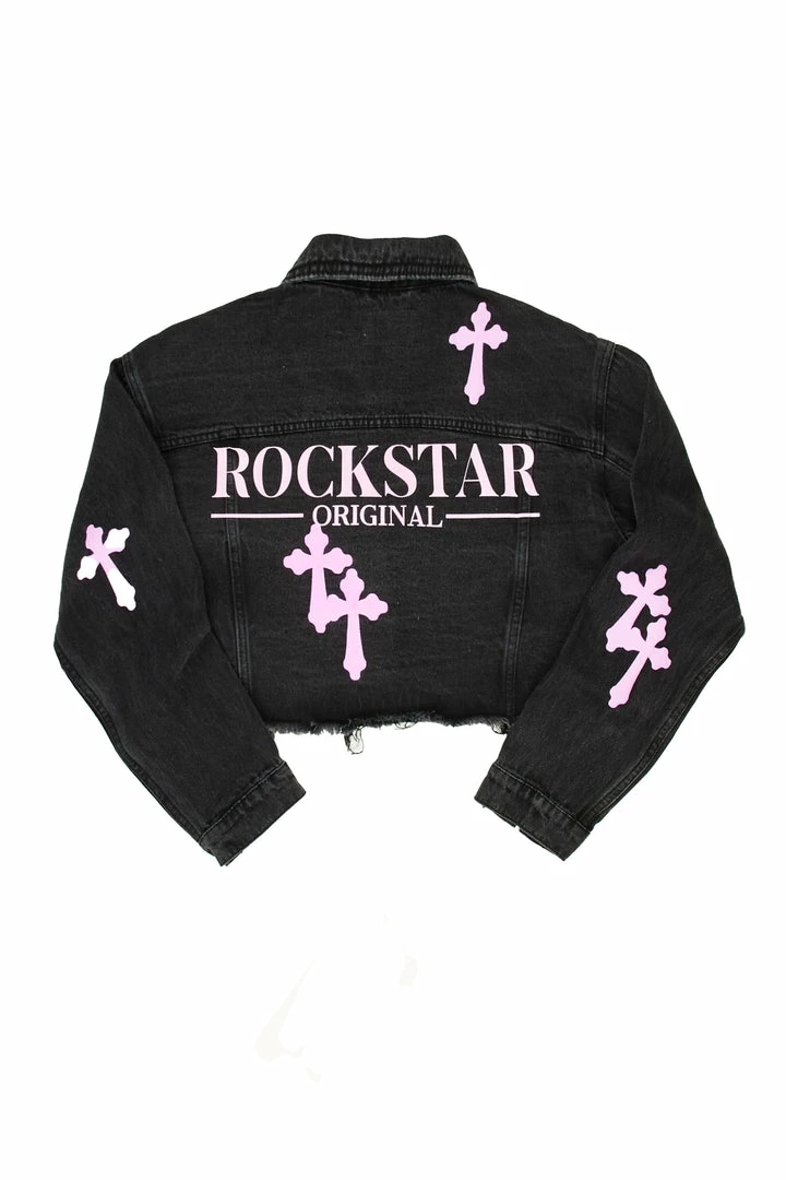 Rockstar Original Women’s denim jacket in black. Featuring a printed RSO logo with cross graphics throughout to match. Accenting a collared neckline with a front button placket closure, dual button chest pockets and a cropped length. Style with a matching short set for a casual Rockstar babe outfit.