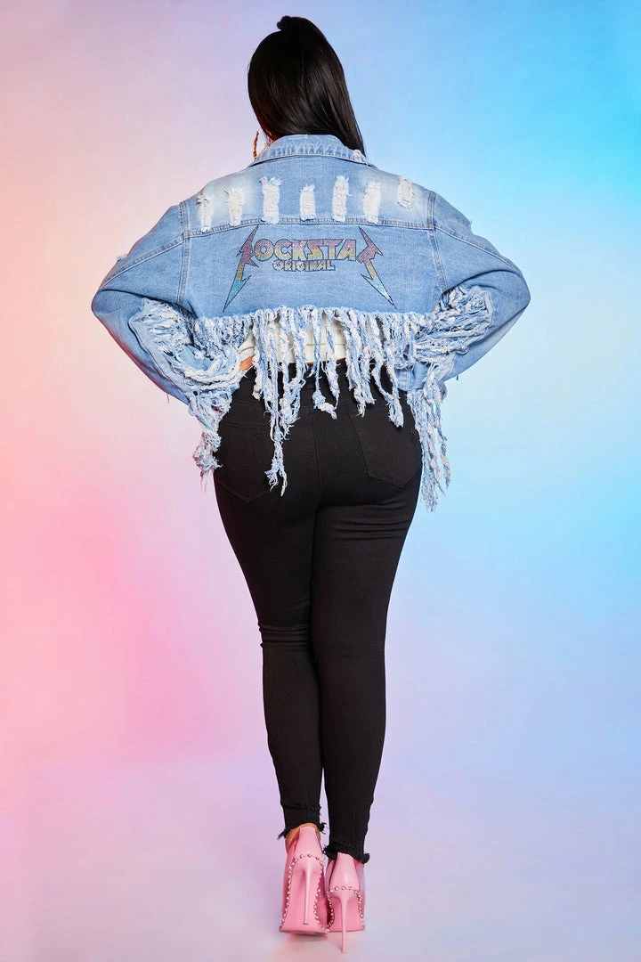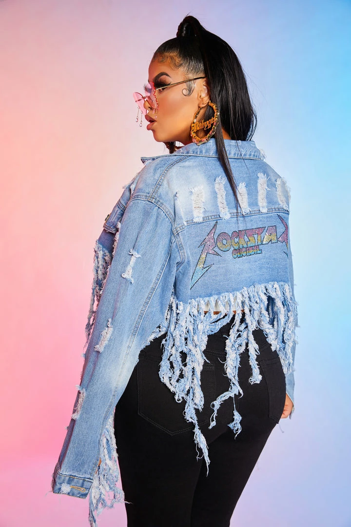 Rockstar Original Women’s denim jacket in light wash. Featuring a posterior rhinestone RSO logo with a bold frayed finish throughout. This must-have jacket accents a collared neckline with a high quality front button closure, dual chest pockets and a cropped length. Style with your favorite little black dress or denim jeans and corset top for the ultimate Rockstar babe OOTD.