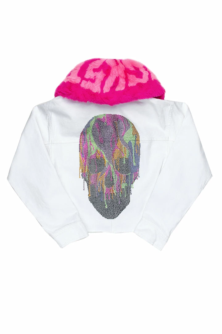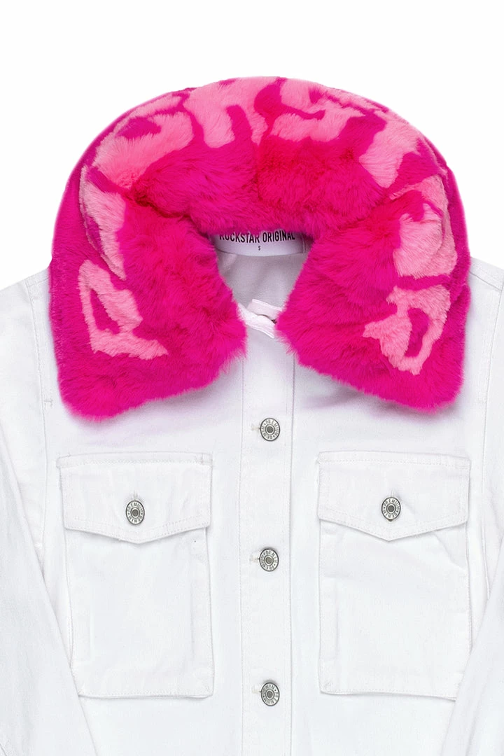 Rockstar Original Women’s denim jacket in white. Featuring a multi color posterior rhinestone graphic and removable fur neckline. This gorgeous denim jacket accents a cropped length with a distressed hem and dual chest pockets with a high quality front button closure.