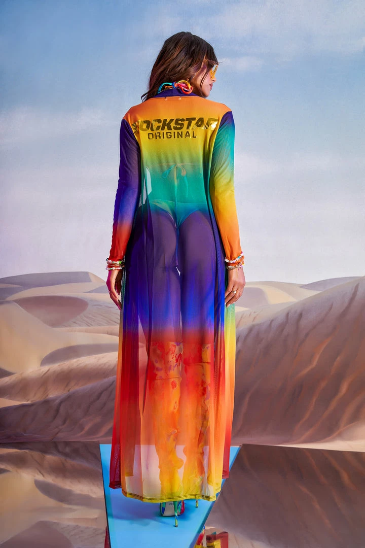 Rockstar Original Women’s Festival Edition mesh kimono in multi color ombre. Featuring a posterior metallic RSO logo, long sleeves and a floor length for the hottest festival babe staple piece!