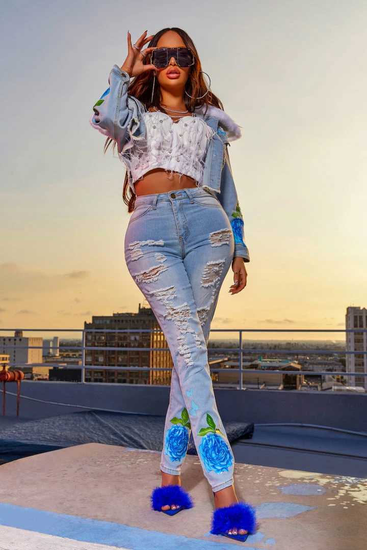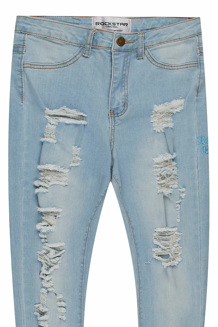 Rockstar Original Women’s denim skinny jean in light wash. Featuring a high-waisted, form-fitting silhouette with distressed detailing and a high quality front button closure. These must-have jeans accent a gorgeous multi color floral graphic and premium cotton threading for style that will move with you and for you as you command all the attention!