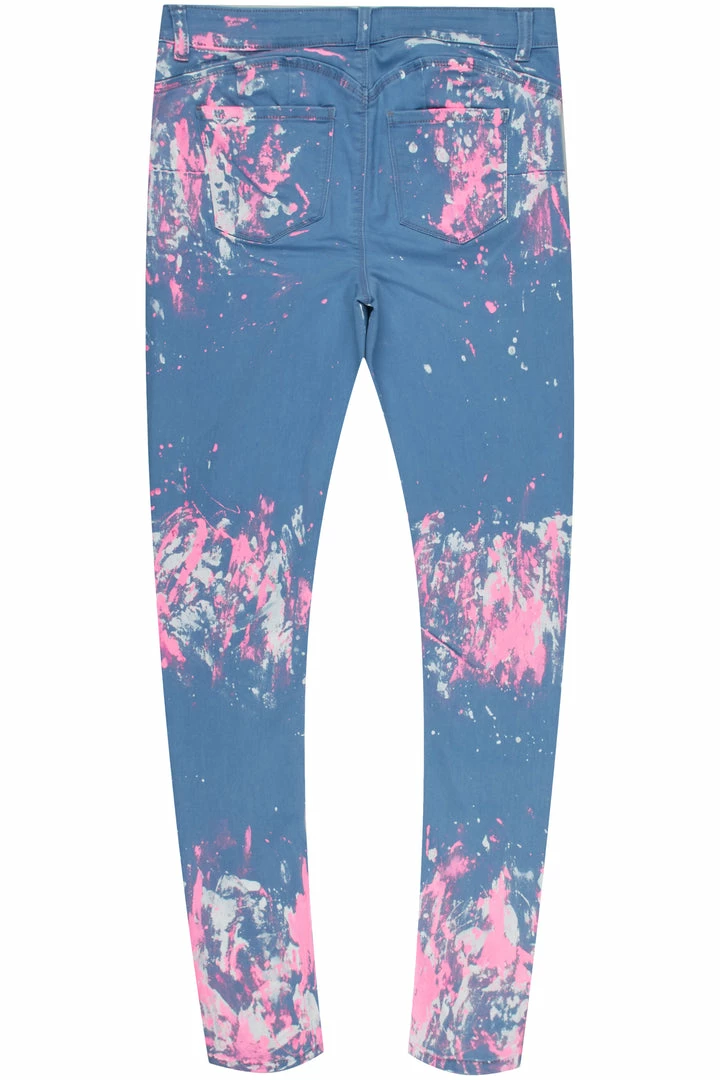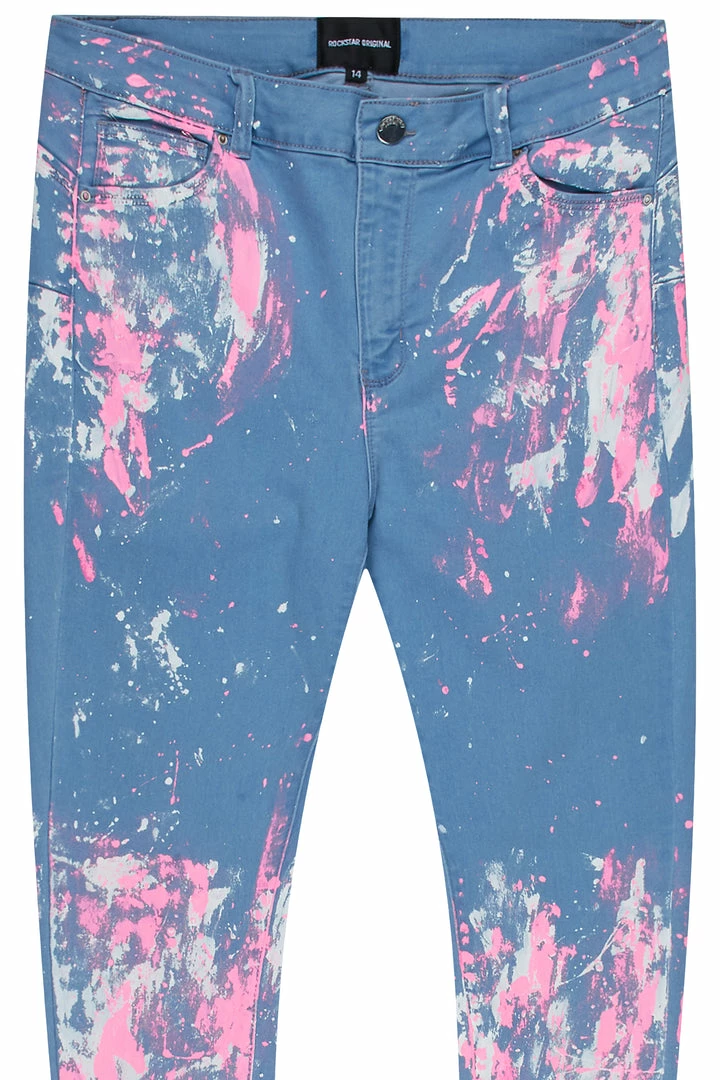 Rockstar Original Women’s midrise denim jean in light wash. Featuring custom splatter paint designing throughout. This one-of-a-kind jean is made with a high quality front button closure, distressed details and premium cotton threading to make you look good and feel better all day long!